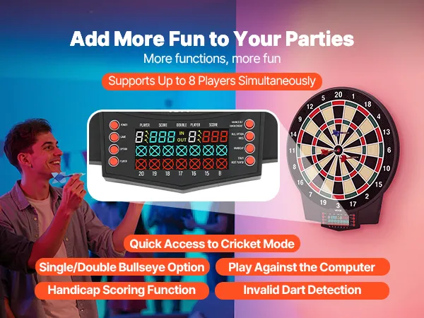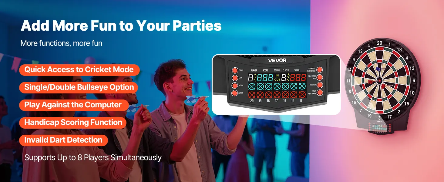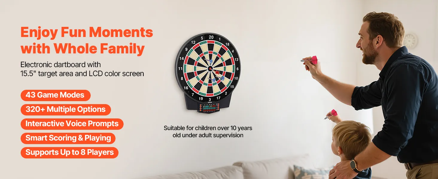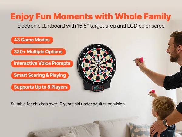 This electronic dartboard comes with 43 game modes and 320+ gameplay combinations, supporting up to 8 players. LCD color screen shows real-time scores and round progress, with multiple built-in functions to make every throw more accurate and engaging. Great for home and party fun.