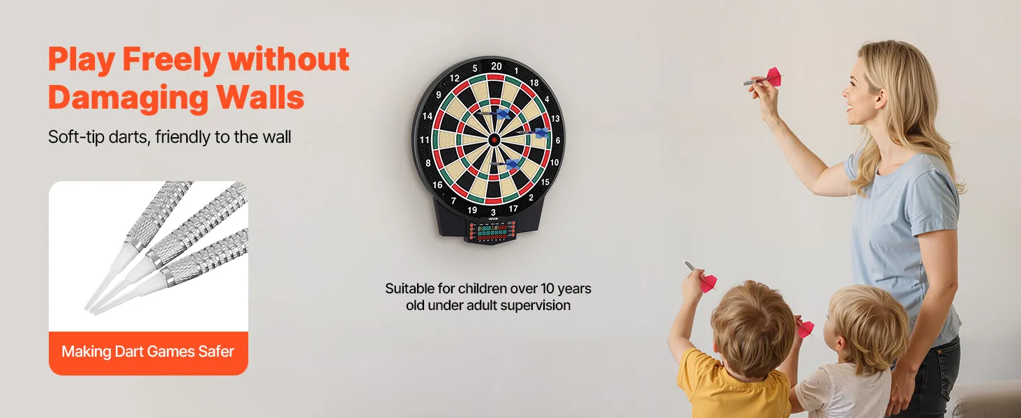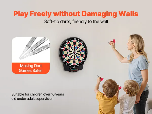 The electronic dart board includes soft dart tips that minimize scratches and impacts, protecting your walls from damages. It delivers a fun-filled and interactive gaming experience at home, parties, or in game rooms.