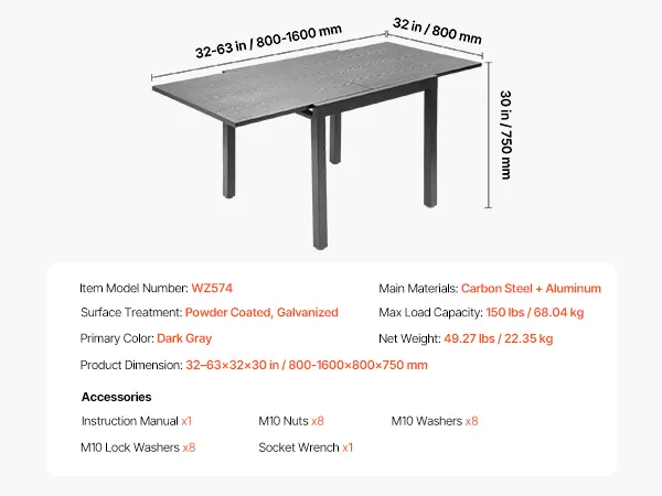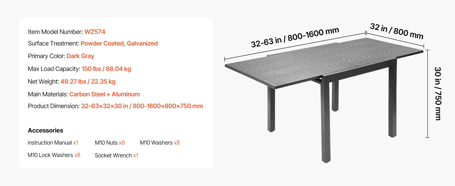 • Expandable Design: This patio dining table is designed for flexibility. It comfortably seats 4 people as a square table (32×32 in / 800×800 mm) and easily extends to a longer table (63×32 in/ 1600×800 mm) to accommodate up to 6 guests when needed