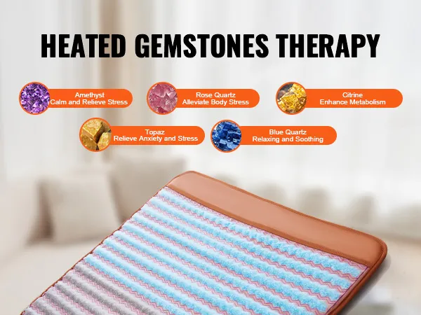 Подушечка с 5 натуральными драгоценными камнями — аметистом, розовым кварцем, цитрином, топазом, голубым кварцем — обеспечивает успокаивающее тепло, снимает напряжение тела, успокаивает разум и улучшает кровообращение, обеспечивая полное расслабление.