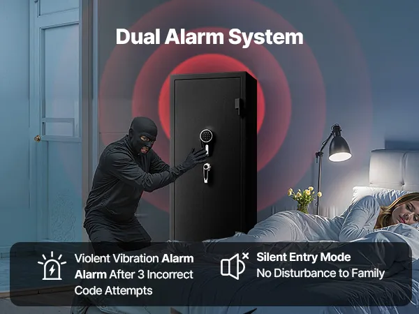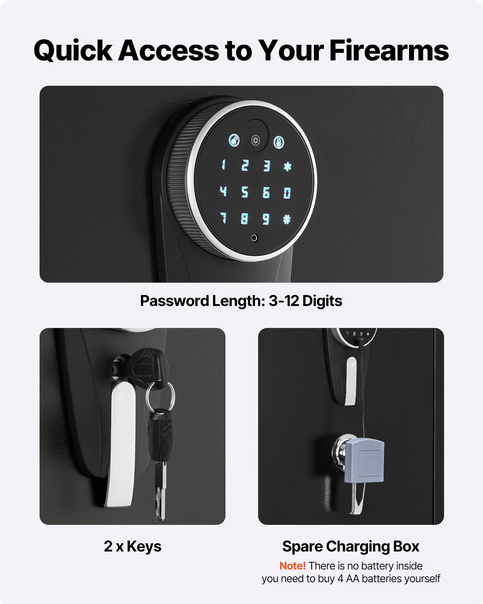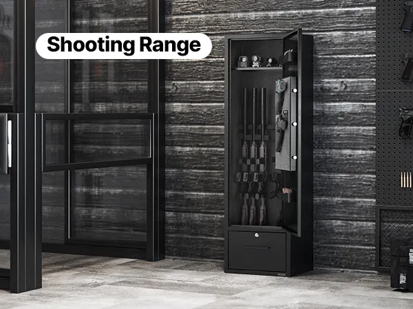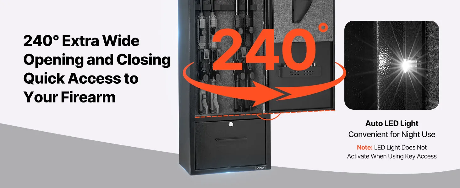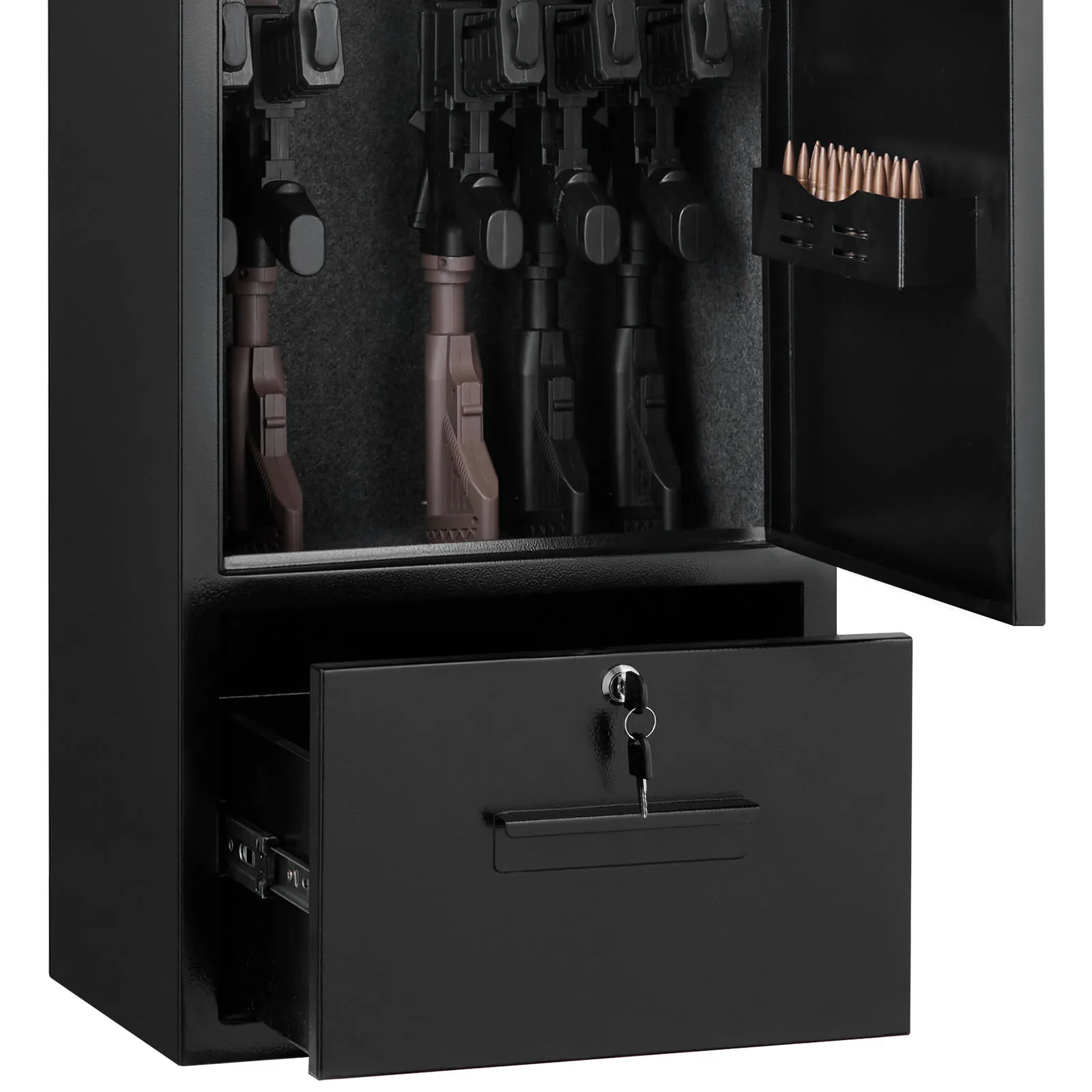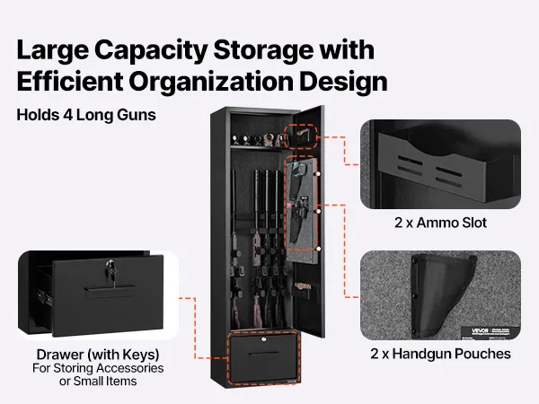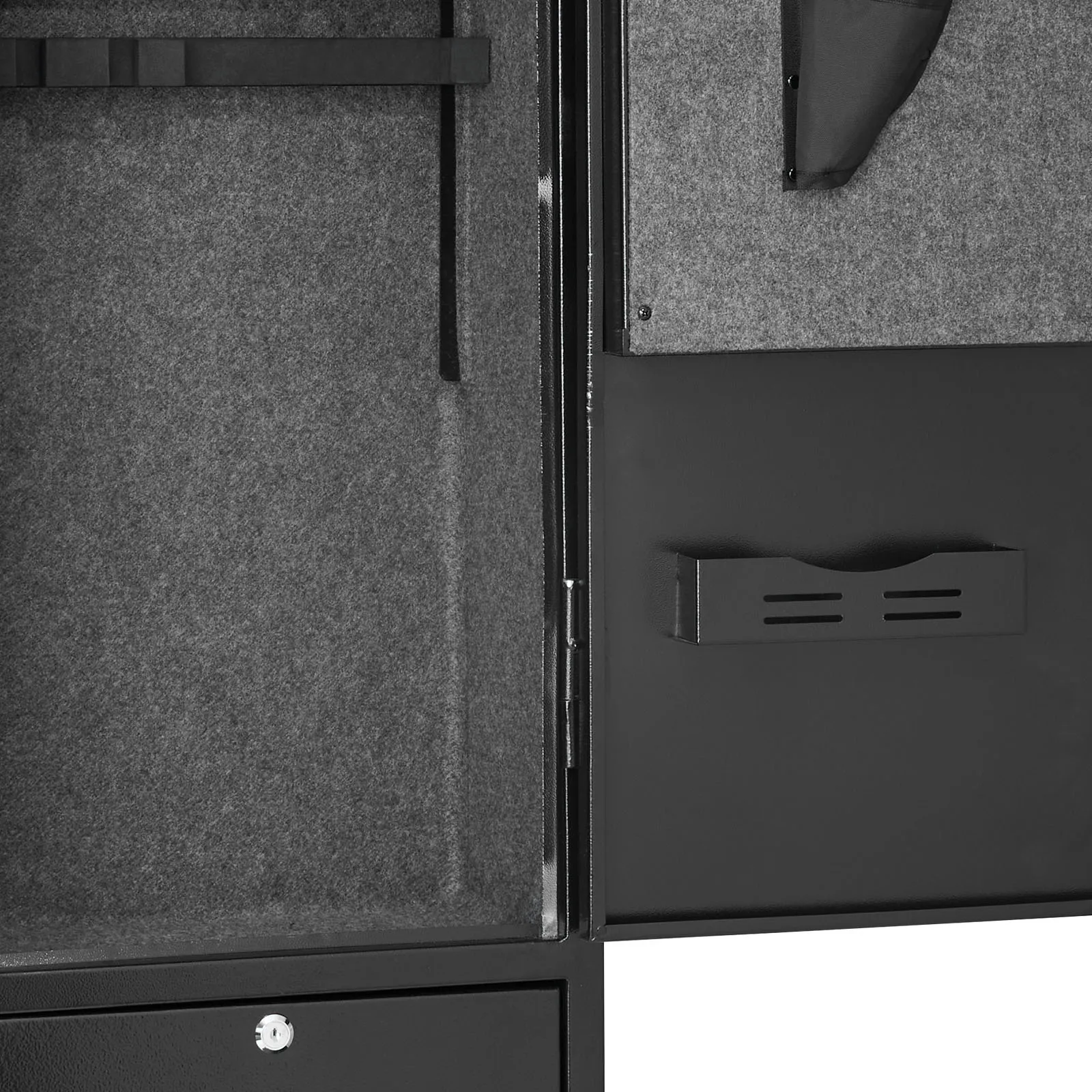 The gun safe can hold up to 4 rifles and features a hidden compartment for storing ammunition and other items, meeting the storage needs of heavy collectors and multi-gun users. It also comes with adjustable racks to accommodate firearms of different lengths.