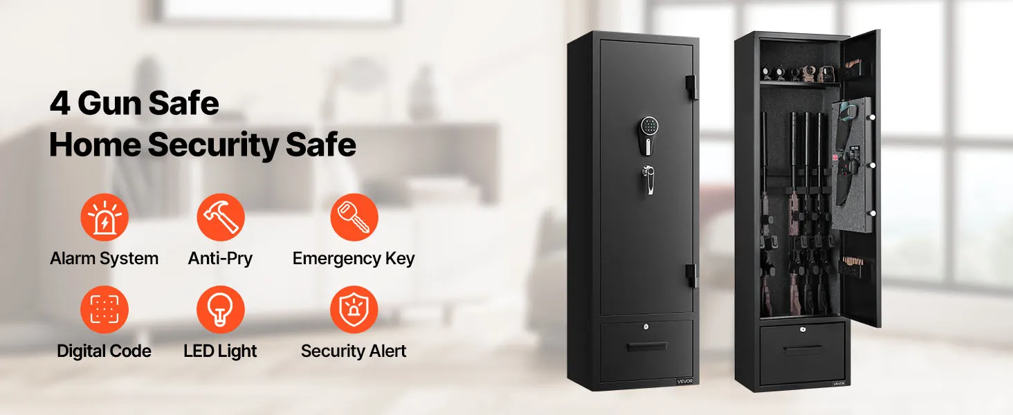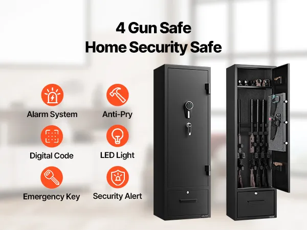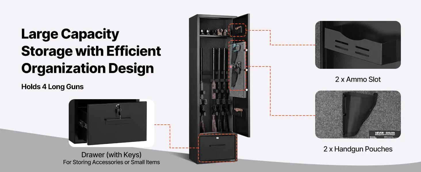 VEVOR 4 Gun Safe, Long Gun Cabinet for Rifles and Pistols, Quick Access Rifle Safe with 2 Ammo Slots, 2 Pistol Pockets & 2 Adjustable Racks, Large Digital Cabinet with Key and Password Lock