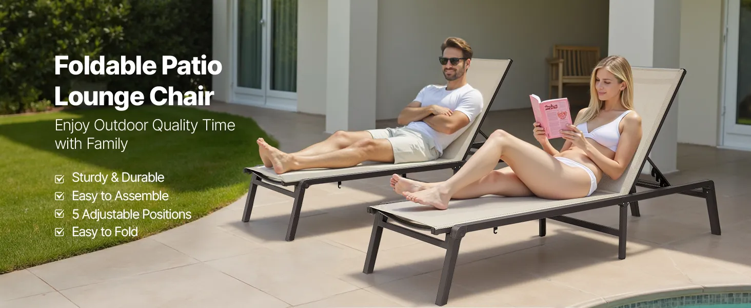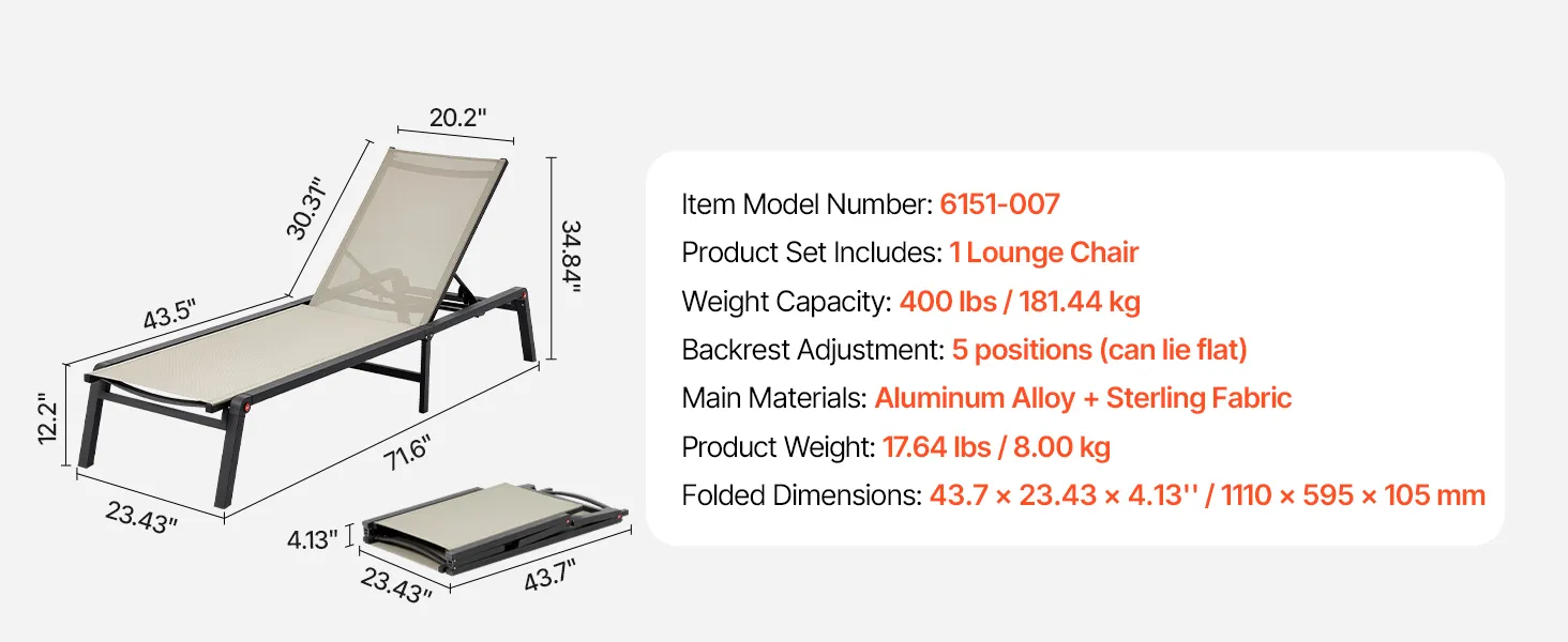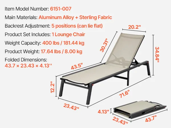 This patio lounge chair with aluminum alloy steel frame supports up to 400 lbs for excellent stability. The 5 adjustable backrest positions offers versatile comfort from sitting to reclining. Made with breathable, waterproof, and easy-clean textilene fabric, it ensures a comfortable experience.