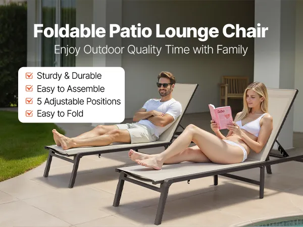 VEVOR Outdoor Chaise Lounge Chair, 181 kg Weight Capacity, Foldable Sun Tanning Chair, 5 Adjustable Positions, Easy Assembly, Heavy Duty Aluminum Pool Recliner Lounge Chairs, for Beach Yard Patio