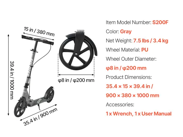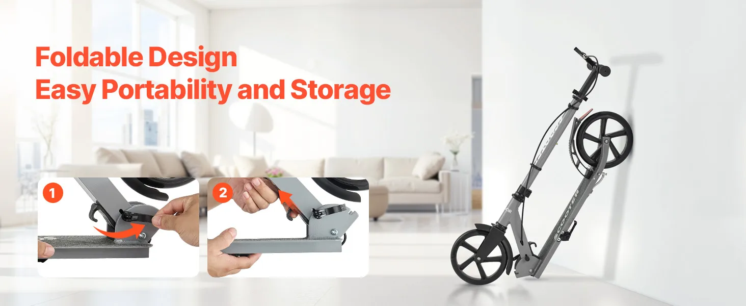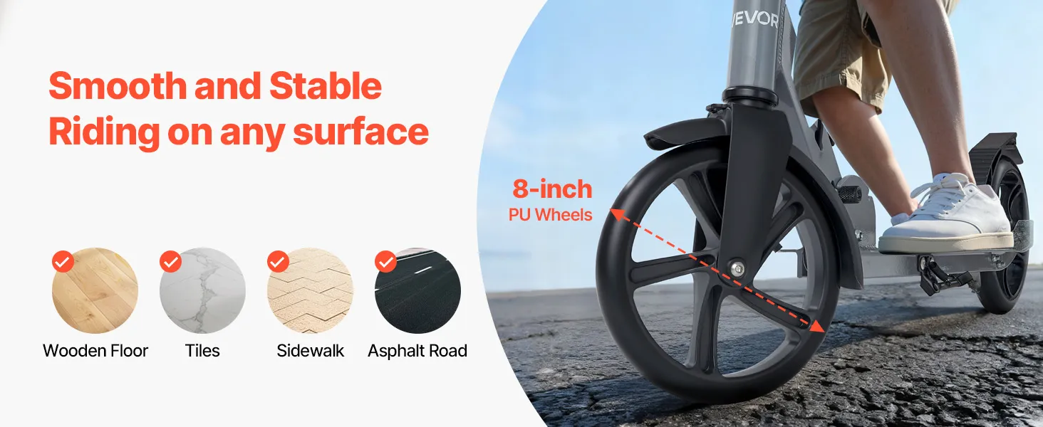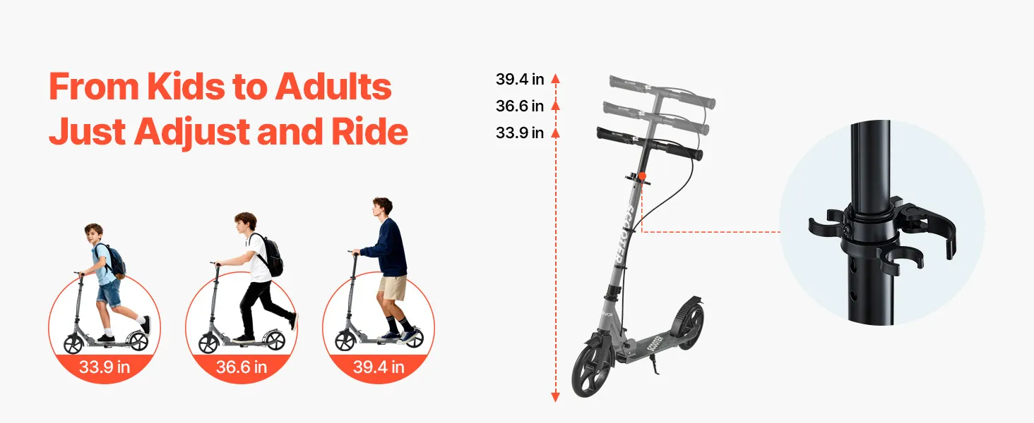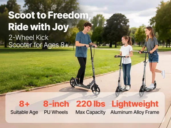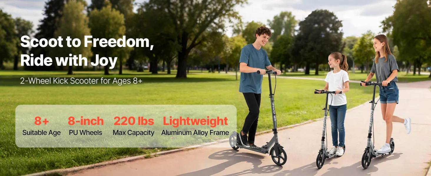 VEVOR Kick Scooter for Kids Ages 8+, Teens & Adults, 2-Wheel Toddler Scooter with Adjustable Height Handlebar, Wide Anti-Slip Deck, Foldable Lightweight Frame for Boys and Girls up to 99.8 kg, Gray