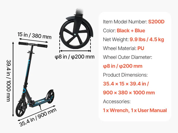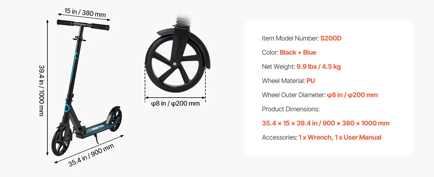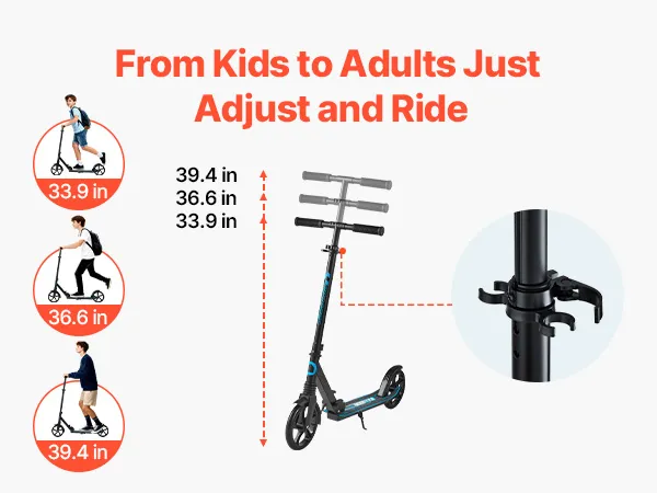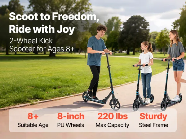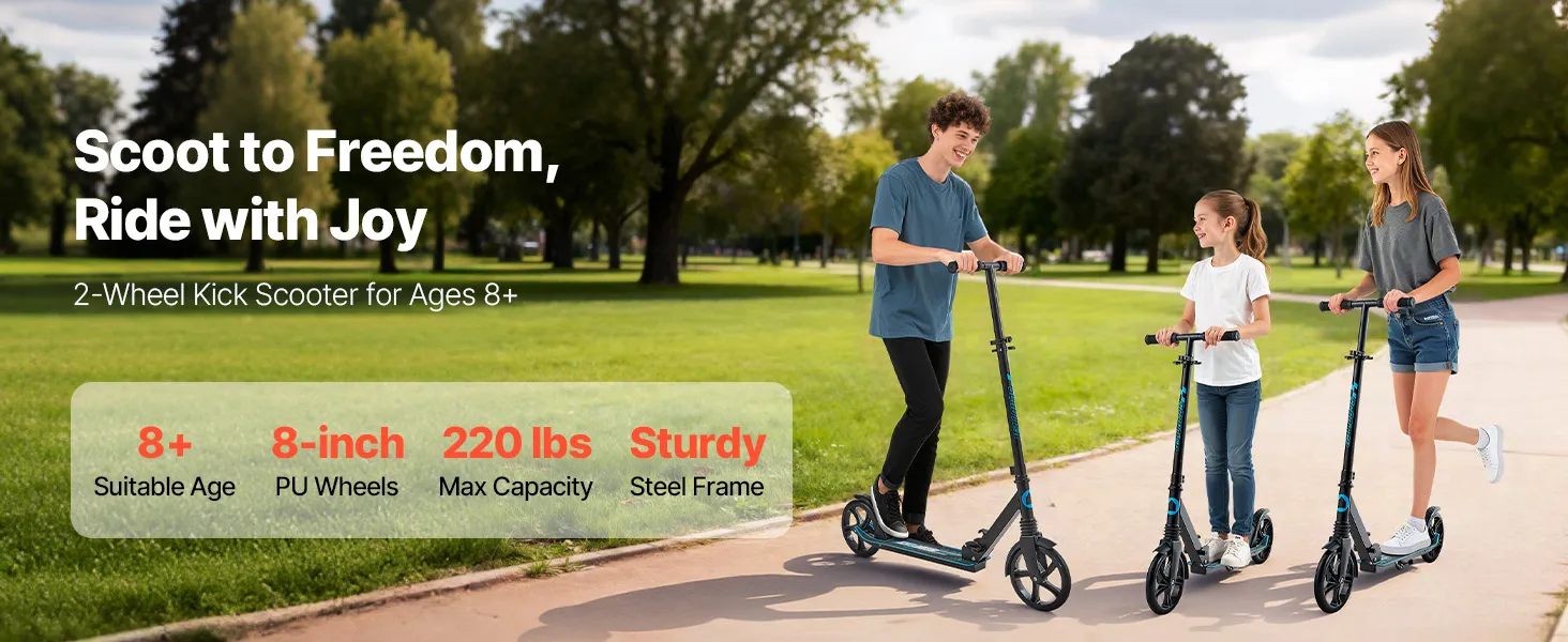 VEVOR Kick Scooter for Kids Ages 8+, Teens & Adults, 2-Wheel Toddler Scooter with Adjustable Height Handlebar, Wide Anti-Slip Deck, Foldable Lightweight for Boys & Girls up to 99.8 kg, Black + Blue