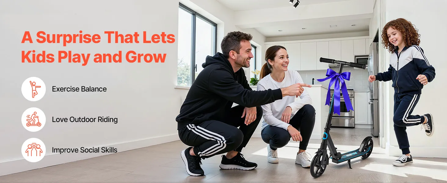 This kids kick scooter suits different age groups, letting children enjoy active fun while providing parents a convenient travel option. With its high weight capacity and large wheels, it rides smoothly on both indoor floors and outdoor surfaces.