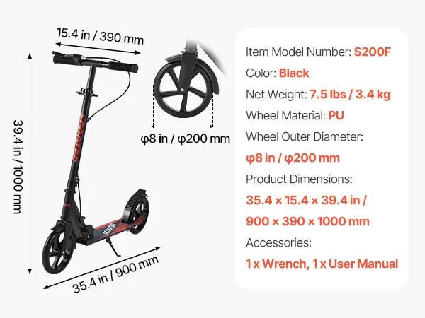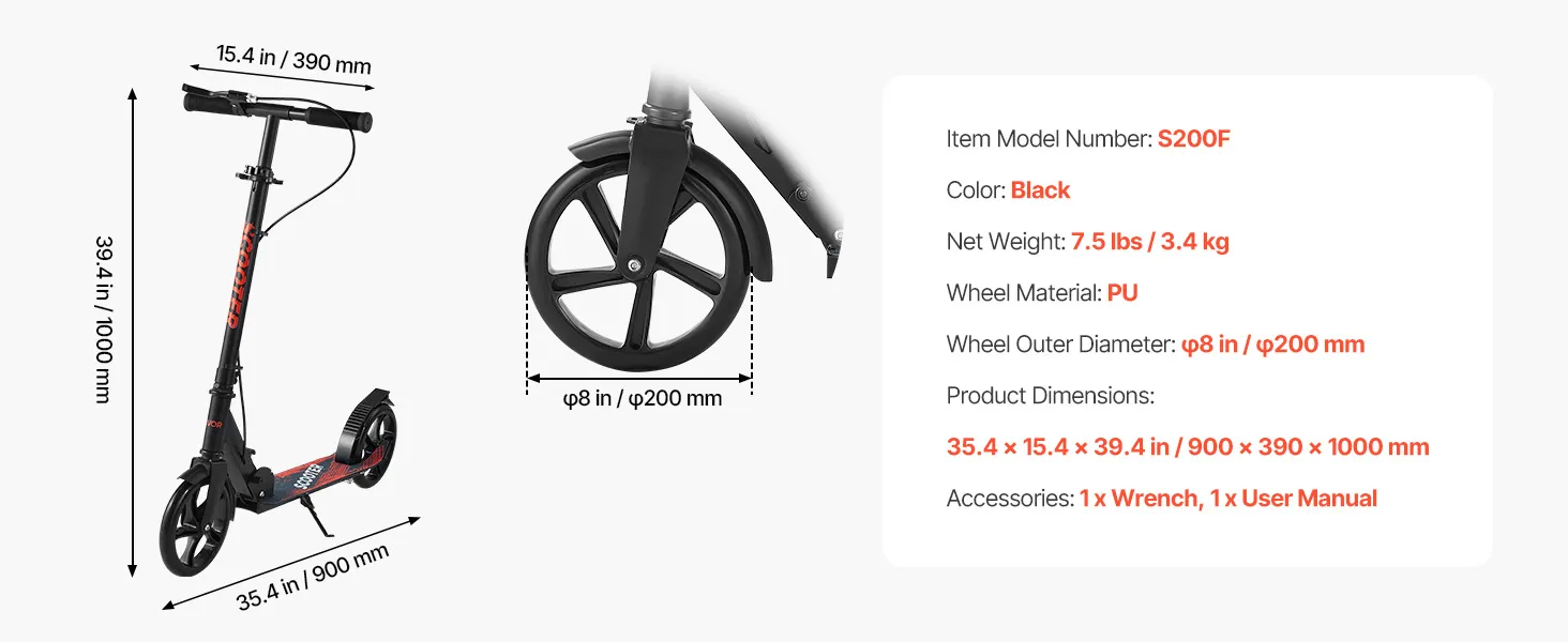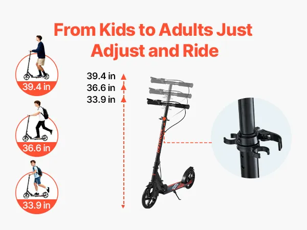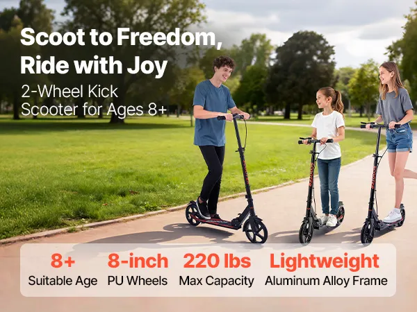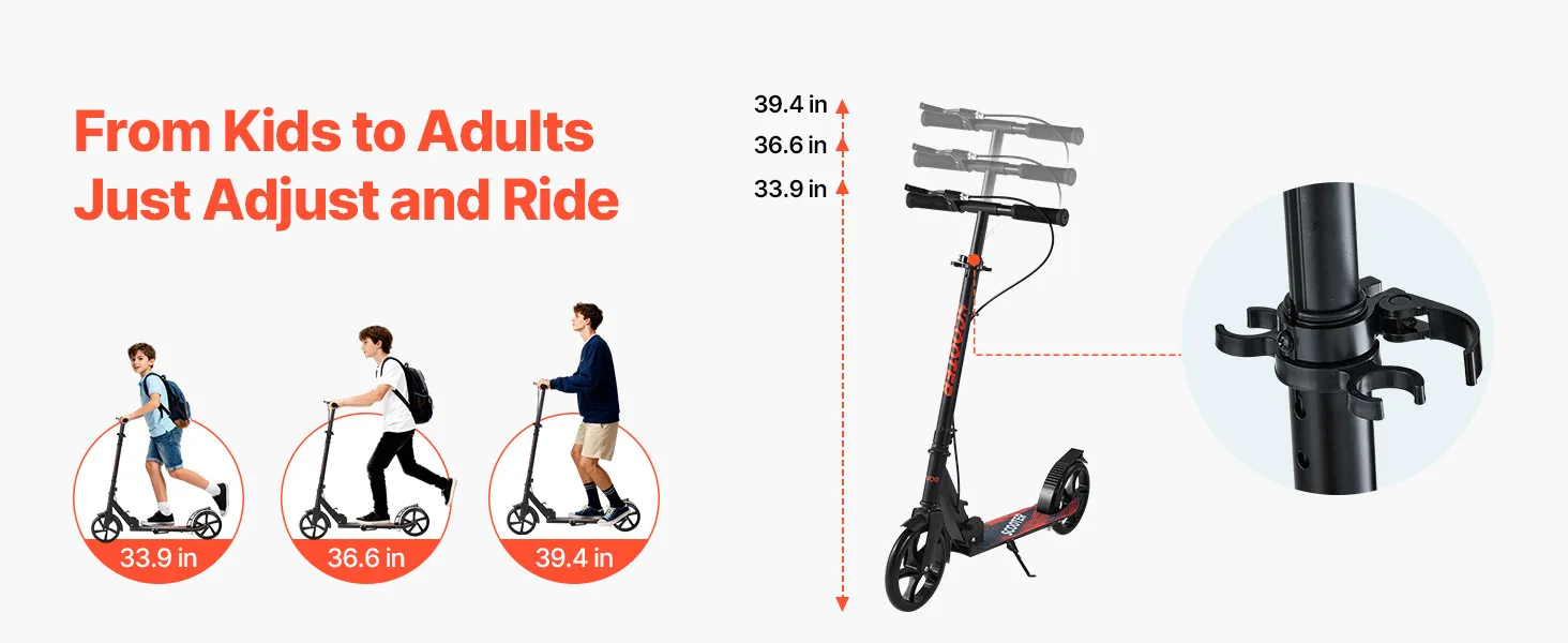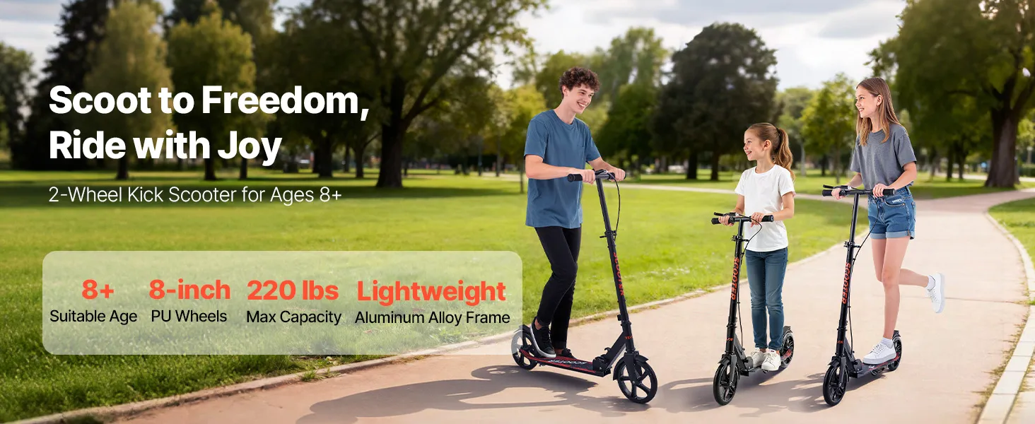VEVOR Kick Scooter for Kids Ages 8+, Teens & Adults, 2-Wheel Toddler Scooter with Height Adjustable Handlebar, Wide Anti-Slip Deck, Foldable Lightweight Frame for Boys & Girls up to 99.8 kg, Black