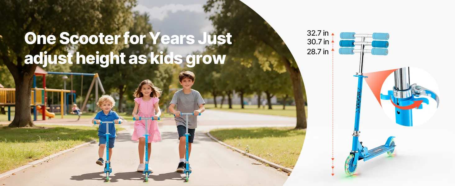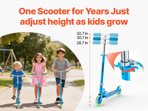 • Adjustable Height: Adjustable handlebar with three height settings: 28.7/30.7/32.7 in (730/780/830 mm). This kids kick scooter grows with your child, so you won’t need to replace it as they grow taller
