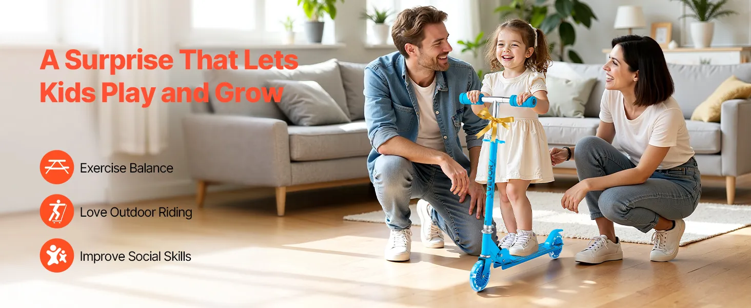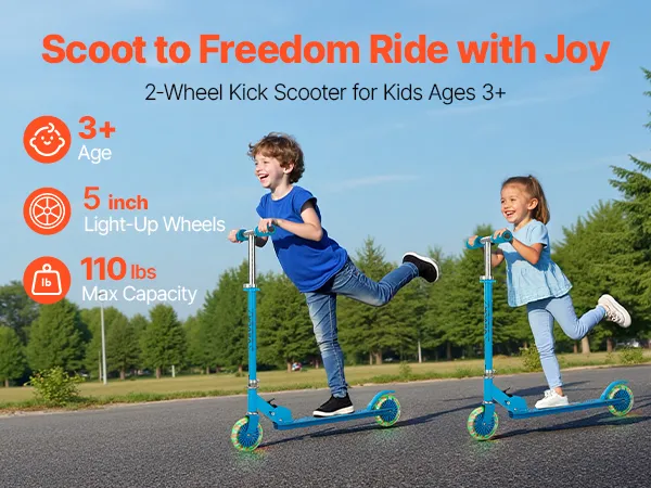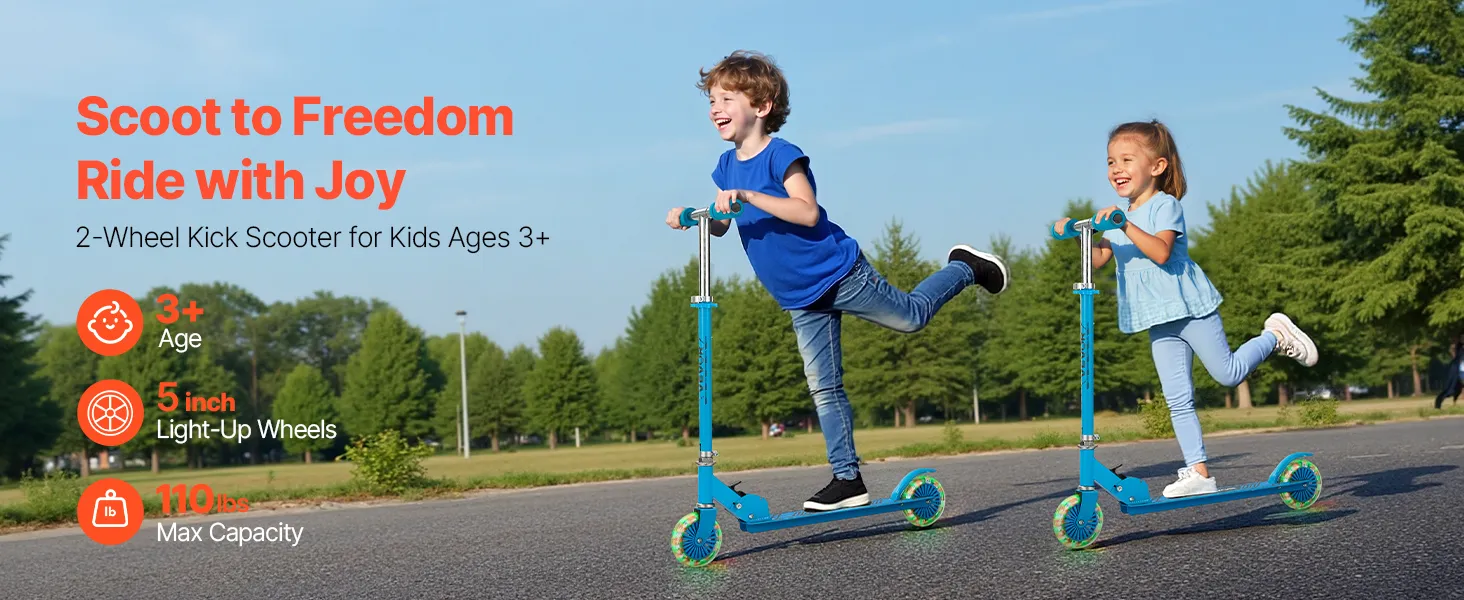 • Kids Scooter for Ages 3+: This 2-wheel kick scooter for kids features an aluminum alloy frame—lightweight, durable, and capable of supporting up to 110 lbs. A fun and active companion that encourages outdoor play, confidence, and joy