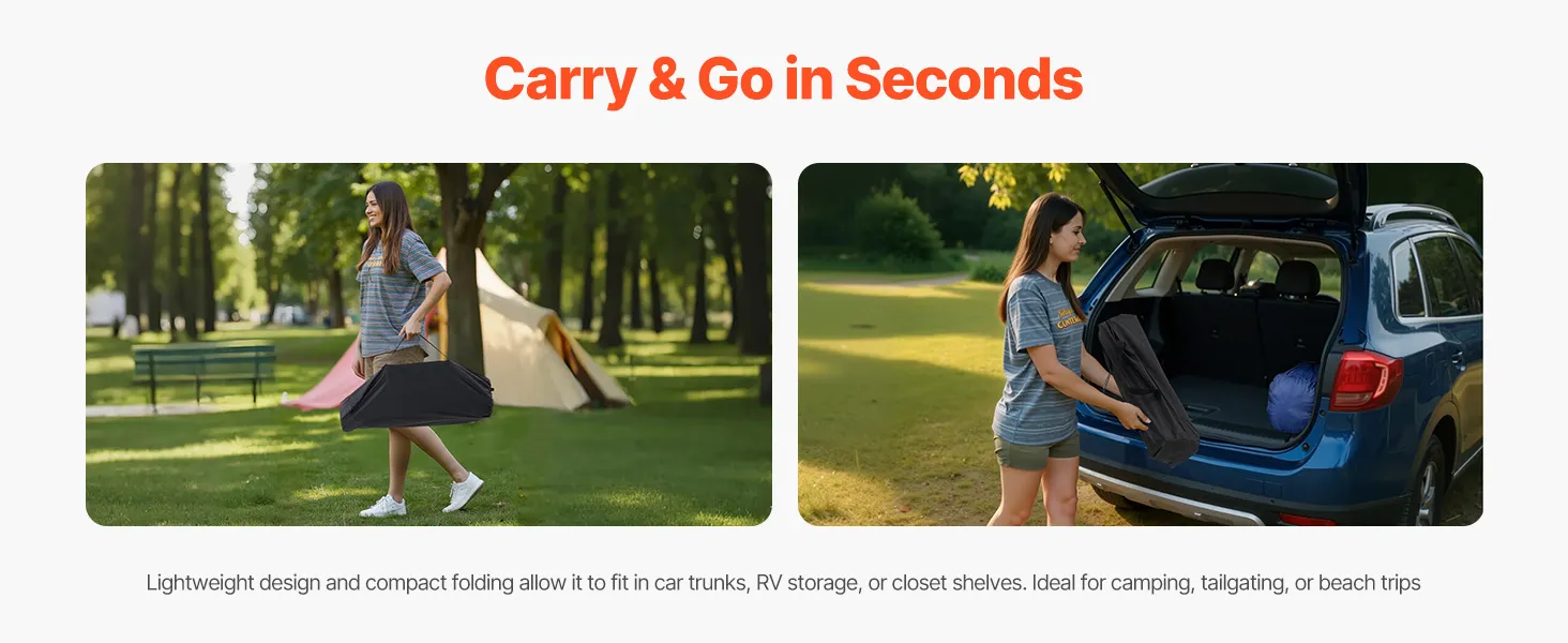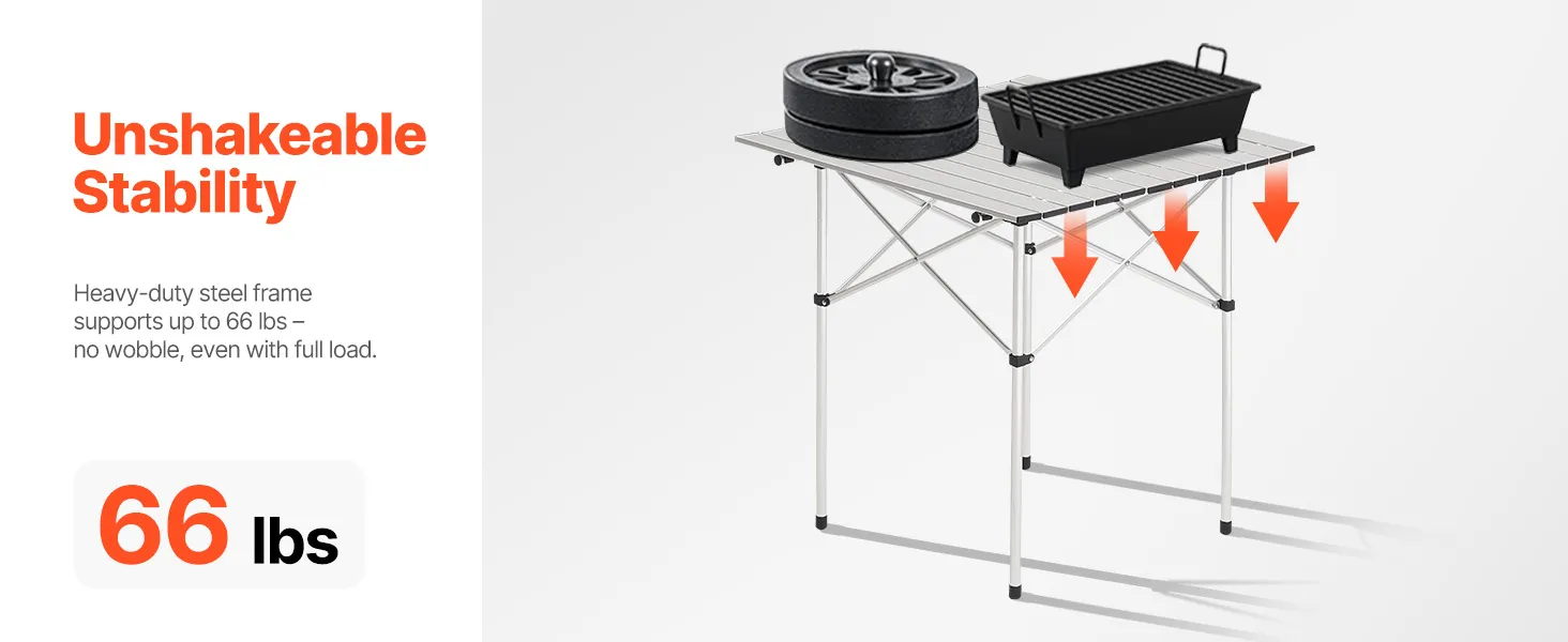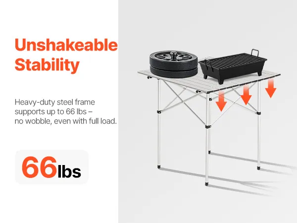 Q: What are the dimensions of the tabletop?A: The tabletop measures 27.6x27.6 inch (700x700 mm), providing ample space for meals, gear, or activities.Q: How much weight can the table support? Is it stable?A: The table supports up to 66 lbs (30 kg) and features a robust frame with legs that resist wobbling.Q: How much does the table weigh? Is it easy to move?The table is lightweight at 2.6 kg / 5.7 lbs, folds compactly, and is easy to move with the included storage bag.Q: Is assembly required? How complicated is it?A: No tools are needed – simply follow the included installation manual for assembly. Setup is quick and intuitive for anyone.