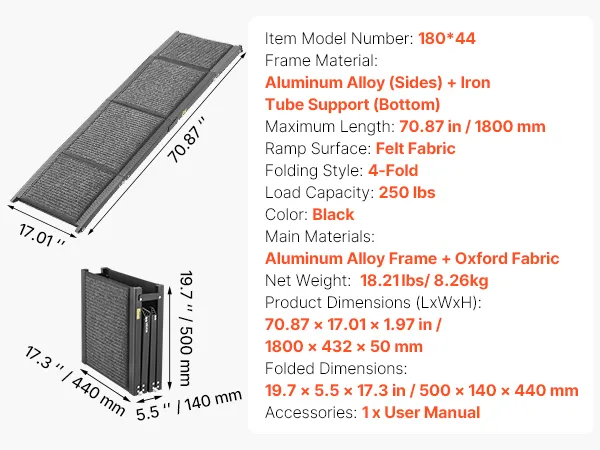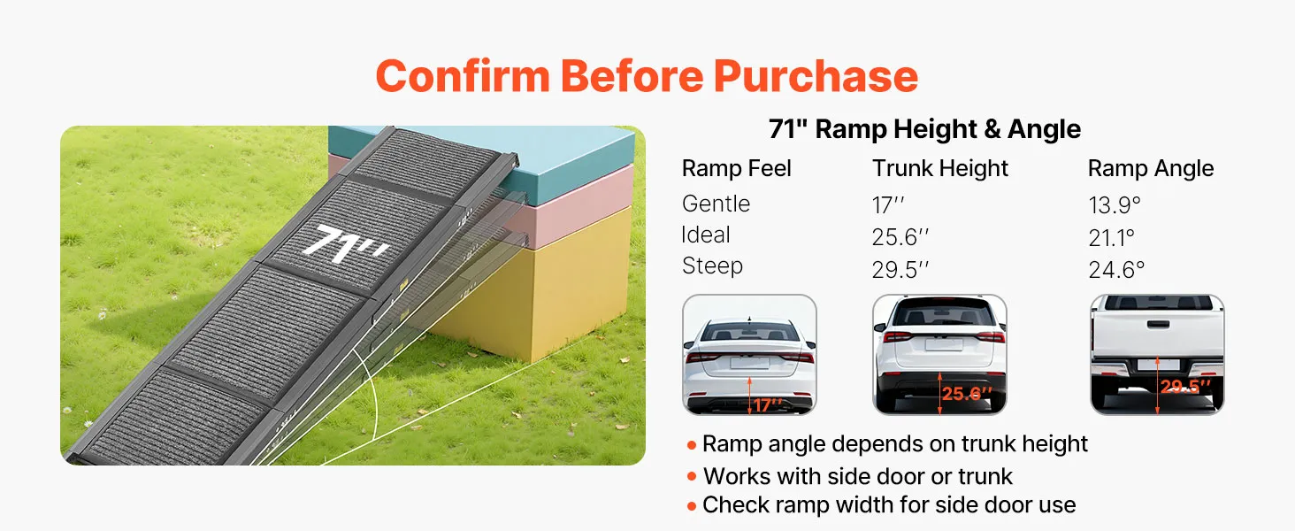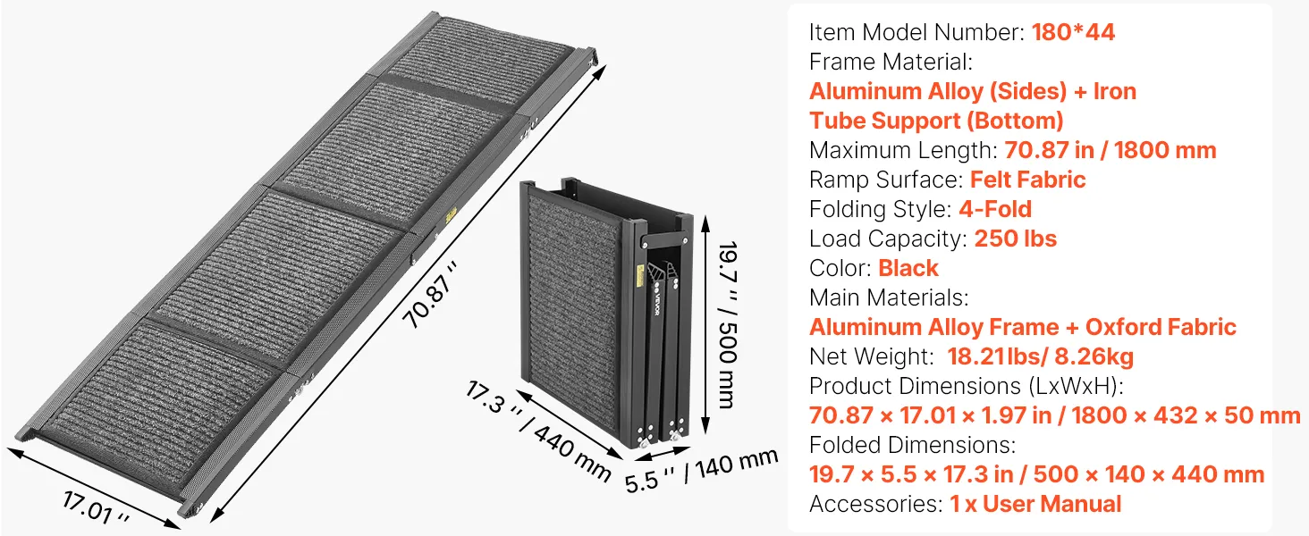 • Extended, Gentle Slope: Extending to 71 in/180 cm long and 17 in /43 cm wide, the folding dog ramp offers a gentler angle with vehicles, reducing strain on your pet’s muscles and joints while jumping