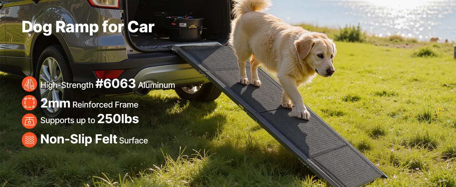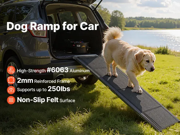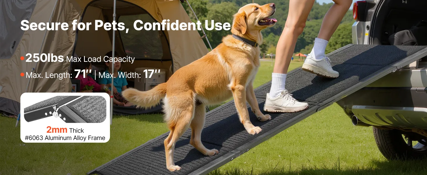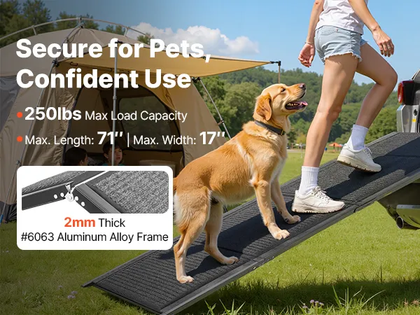 • Secure & Sturdy Ramp: Crafted from high-strength 6063 aluminum with reinforced 2mm edges, this dog ramp for cars supports up to 250 lbs, ensuring stability and peace of mind for your pets