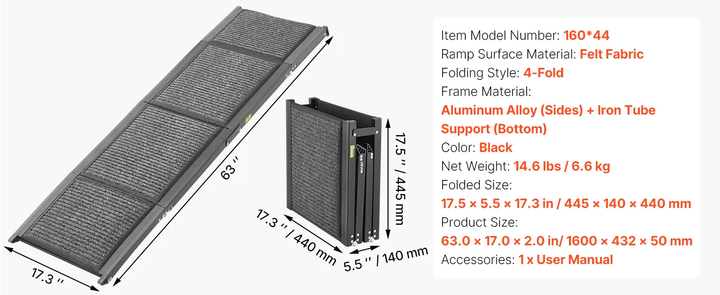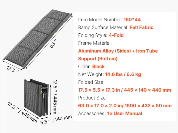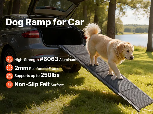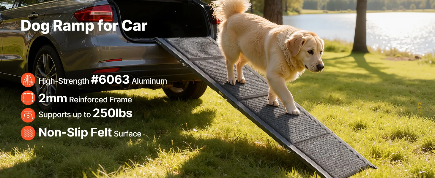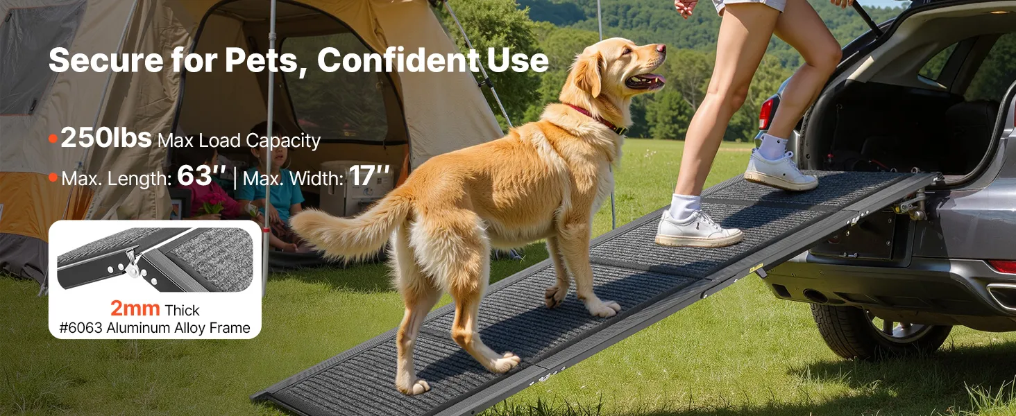 This 63 in extended pet ramp with a high-strength 6063 aluminum and 2 mm reinforced frame, supports up to 250 lbs. The sturdy build avoids wobbling, and the non-slip surface keeps pets steady moving up or down.