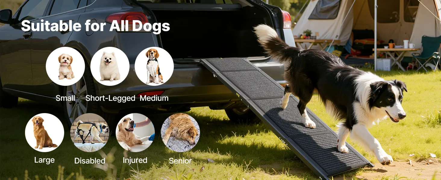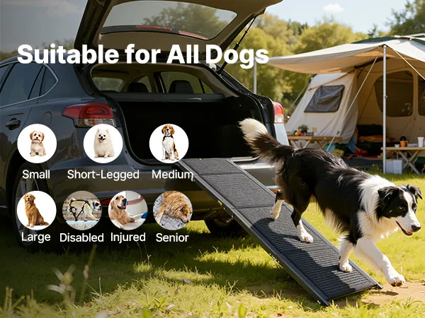 The folding dog ramp is ideal for dogs of all sizes and conditions, including small, short-legged, medium, large, senior, injured, or disabled pets.