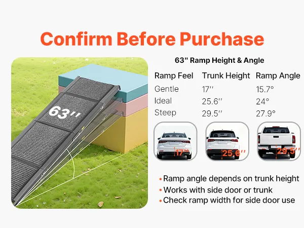 Before buying, please check your vehicle's trunk height and the ramp width to ensure the ramp securely fits your trunk or side door.