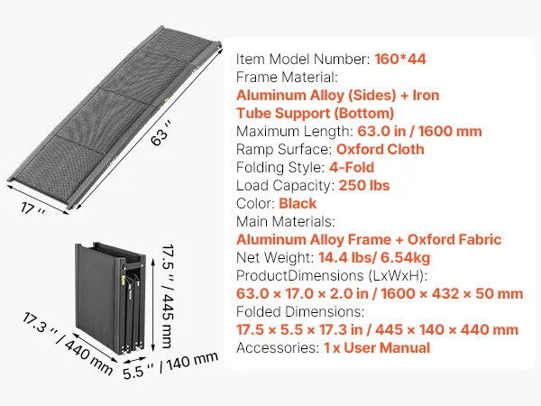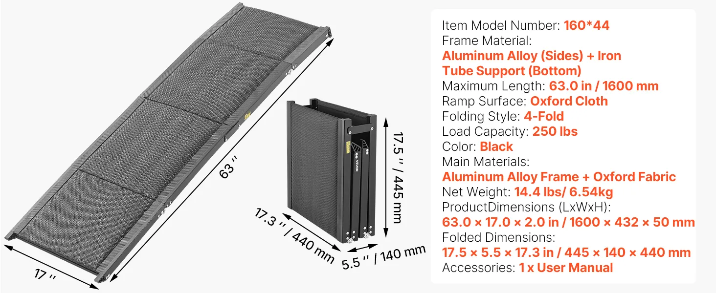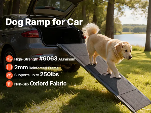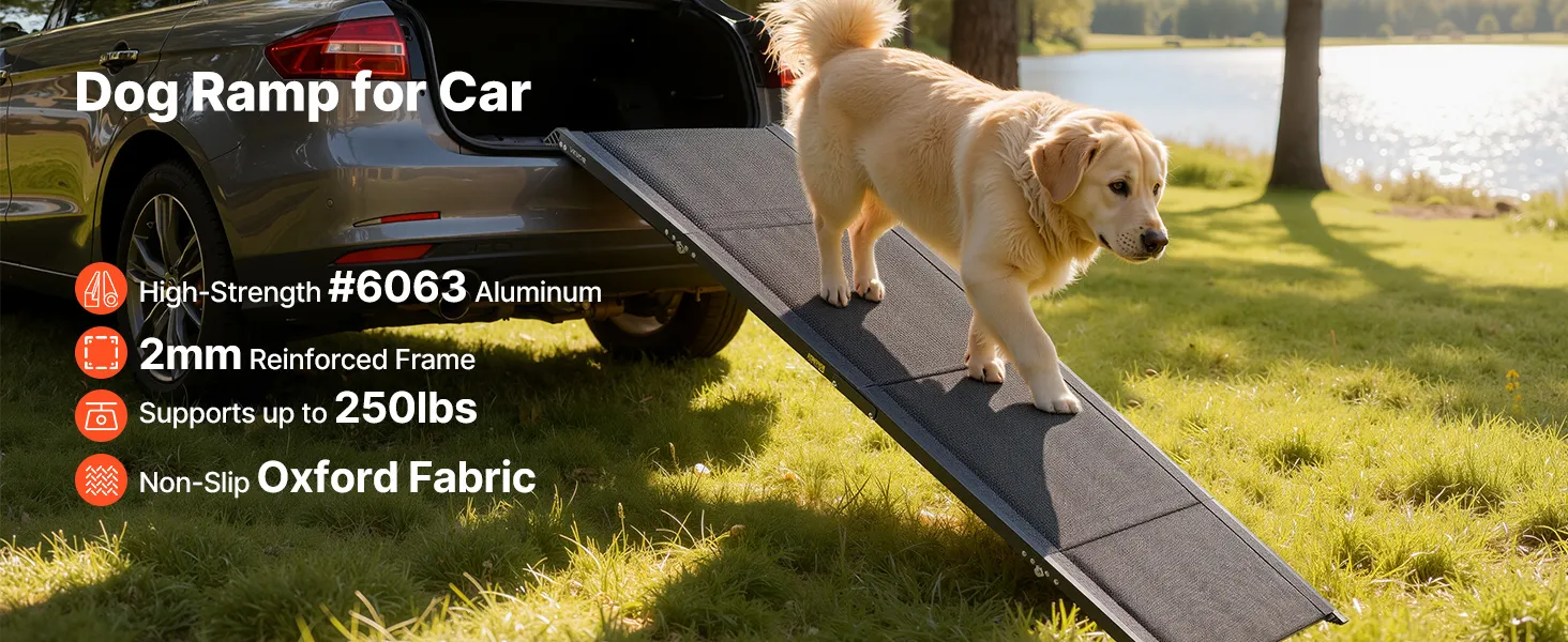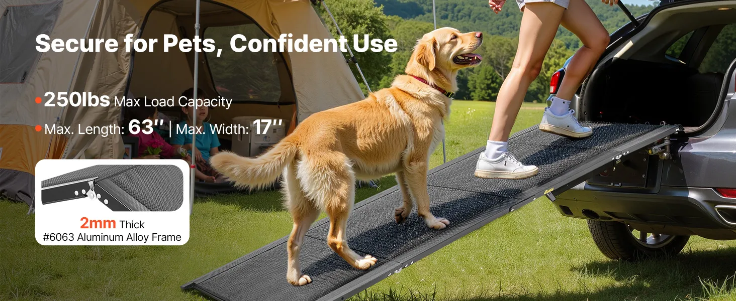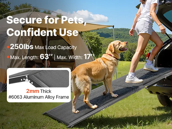 This 63 in extended pet ramp with a high-strength 6063 aluminum and 2 mm reinforced frame, supports up to 250 lbs. The sturdy build avoids wobbling, and the non-slip surface keeps pets steady moving up or down.