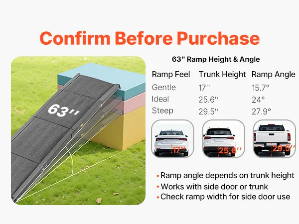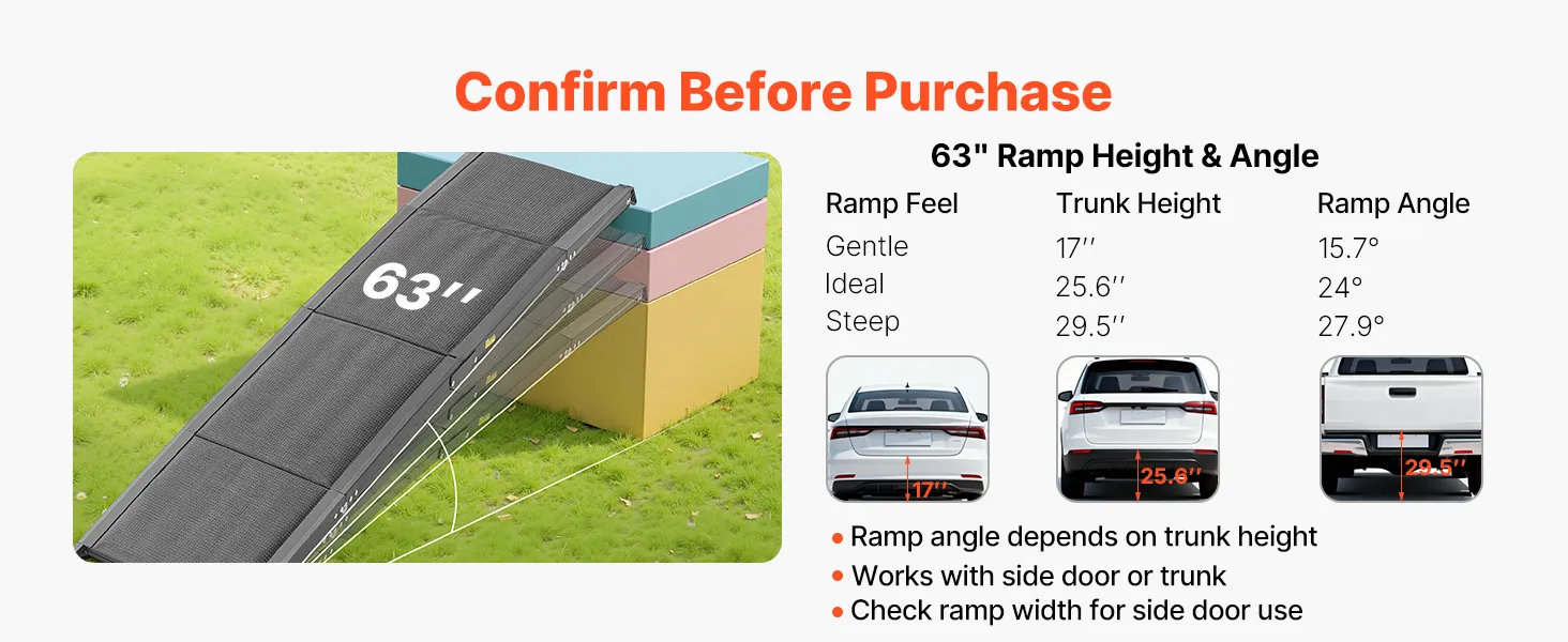 Before buying, please check your vehicle's trunk height and the ramp width to ensure the ramp securely fits your trunk or side door.