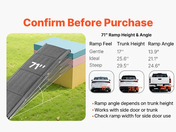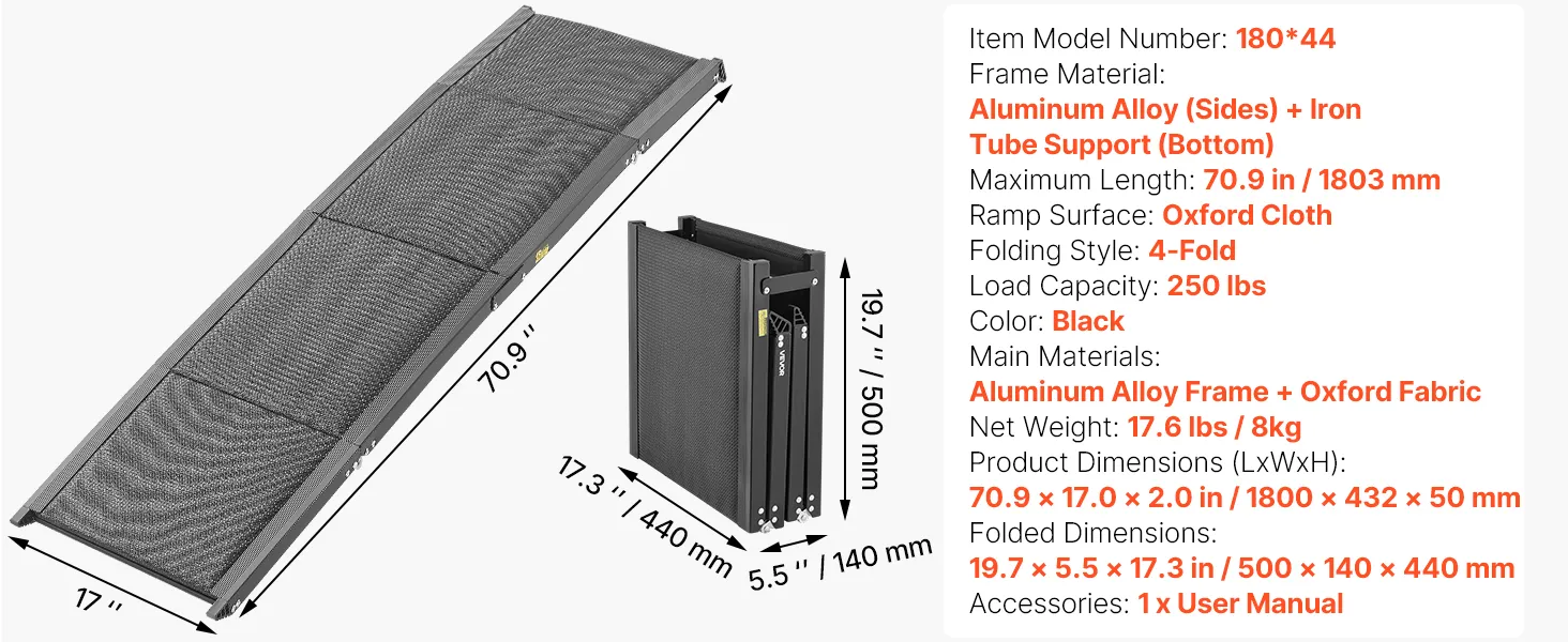 • Extended, Gentle Slope: Extending to 71 in /180 cm long and 17 in /43 cm wide, the folding dog ramp offers a gentler angle with vehicles, reducing strain on your pet’s muscles and joints while jumping