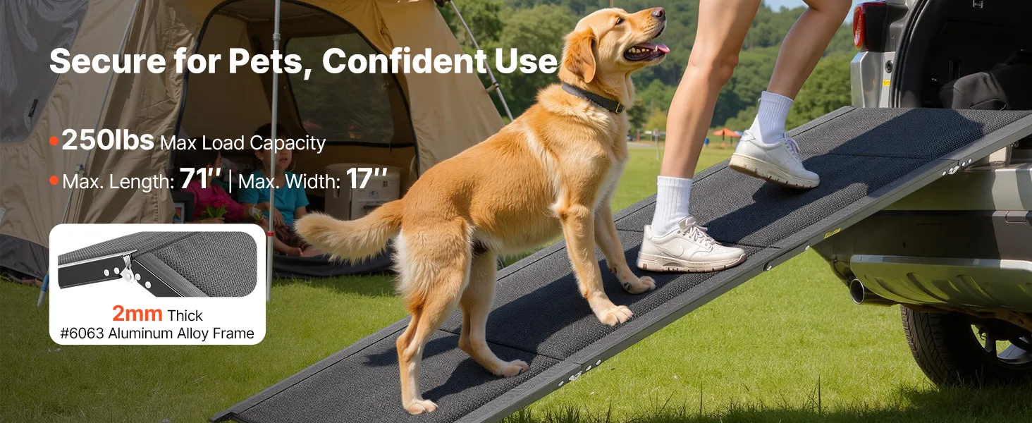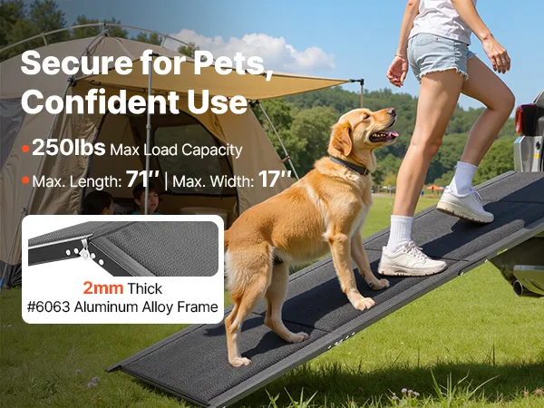 • Secure & Sturdy Ramp: Crafted from high-strength 6063 aluminum with reinforced 2mm edges, this dog ramp for cars supports up to 250 lbs, ensuring stability and peace of mind for your pets