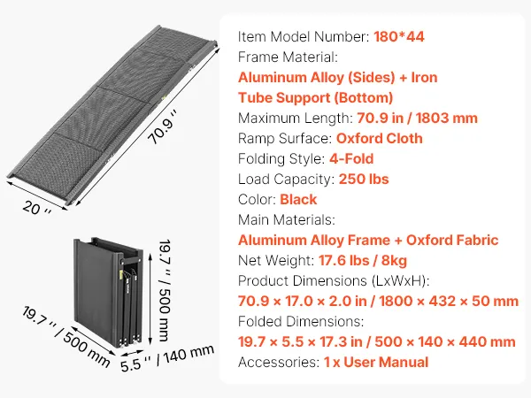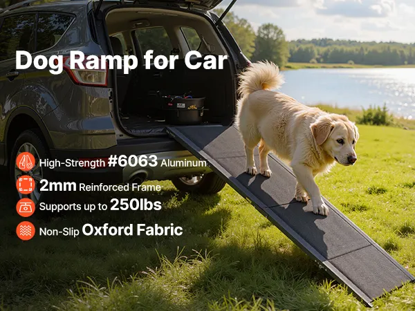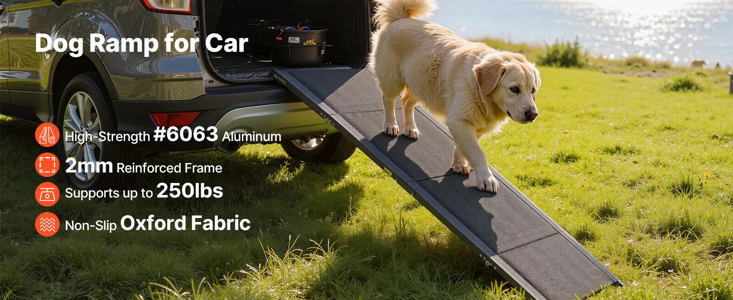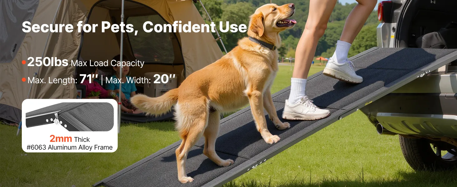 This 80 in extended pet ramp with a high-strength 6063 aluminum and 2 mm reinforced frame, supports up to 250 lbs. The sturdy build avoids wobbling, and the non-slip surface keeps pets steady moving up or down.