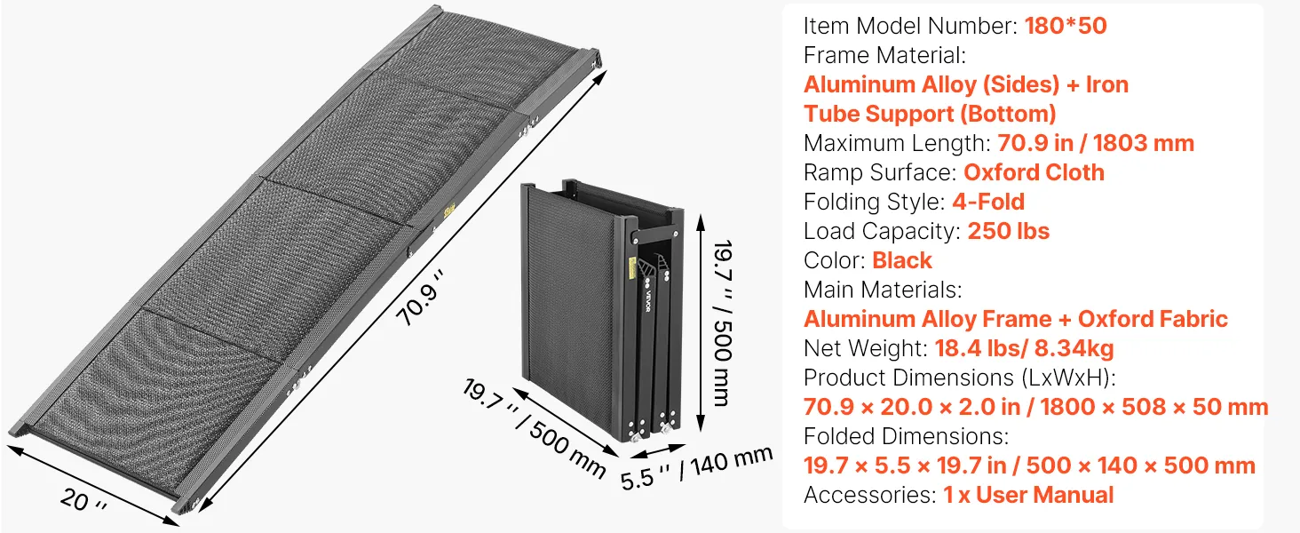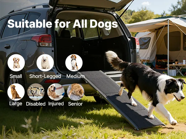 The folding dog ramp is ideal for dogs of all sizes and conditions, including small, short-legged, medium, large, senior, injured, or disabled pets.