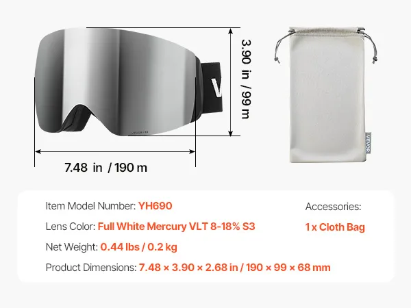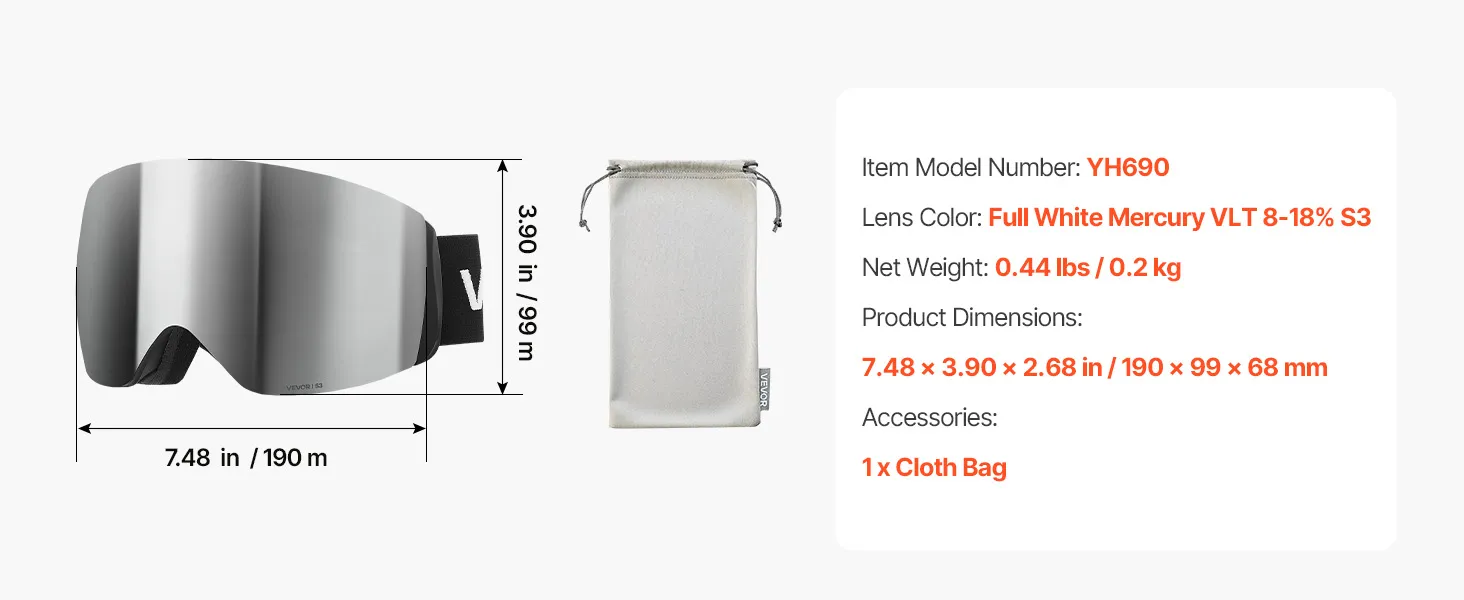 VEVOR Frameless Ski Goggles, Spherical Lens with Silver Mirror Revo Coating, OTG Anti fog Snow Goggles for Men Women, TPU Frame & Ventilation Structure, Suitable for Skiing, Skating, Snowboarding