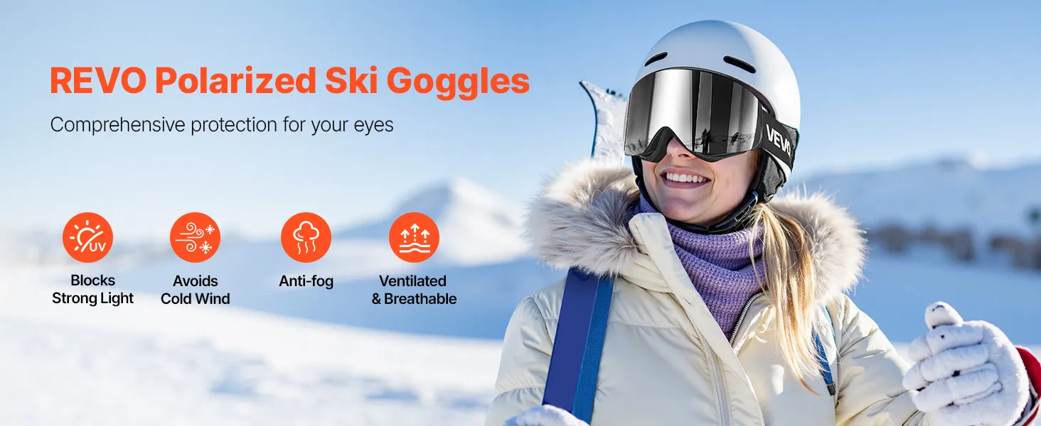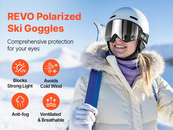 These Revo ski goggles block harsh sunlight and reduce snow glare to help prevent snow blindness. They shield you from cold wind, keep your view fog-free, and maintain fresh airflow so you can enjoy every run with confidence.