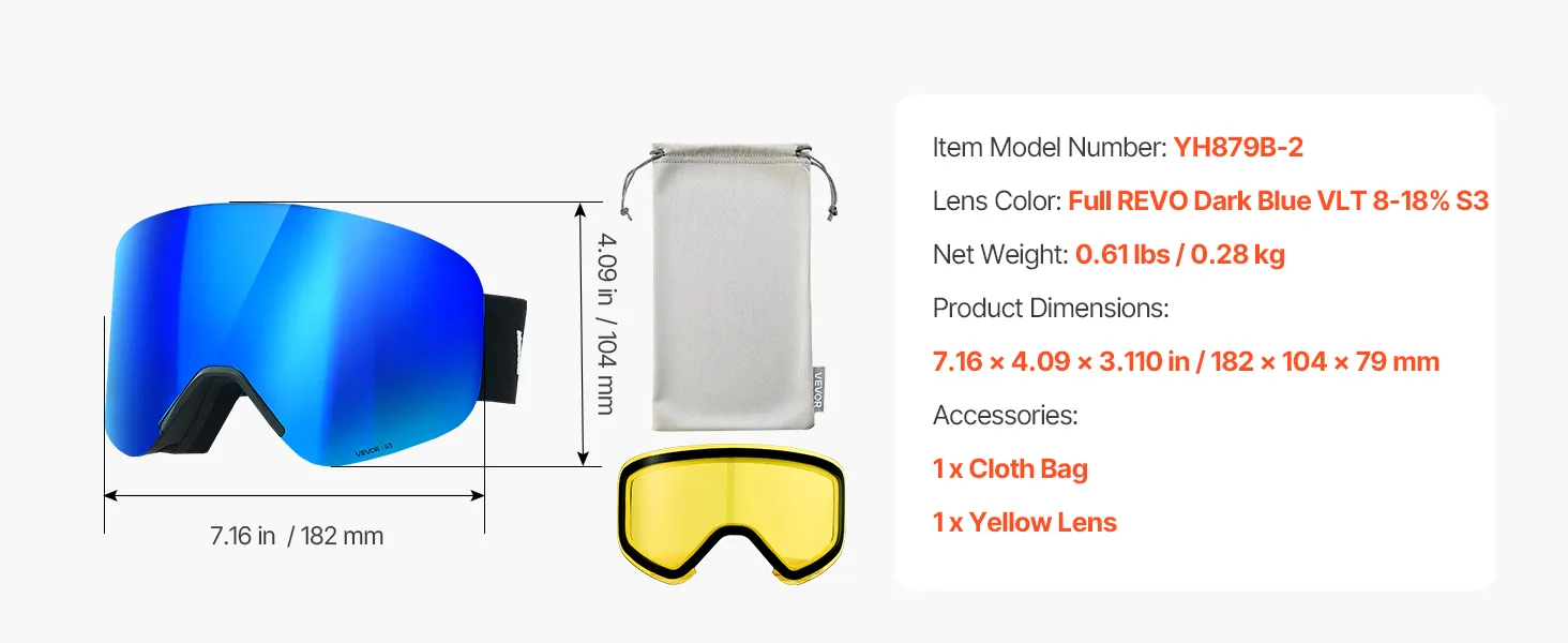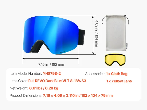 VEVOR Frameless Ski Goggles, Magnet Cylindrical Lens with Dark Blue Revo Coating, OTG Anti fog Snow Goggles for Men Women, TPU Frame & Ventilation Structure, Fit for Skiing, Skating, Snowboarding