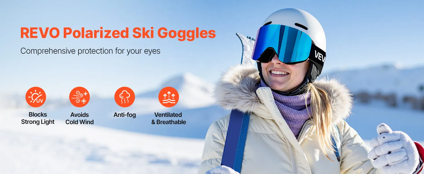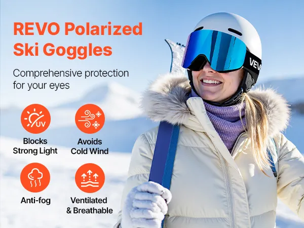 These Revo ski goggles block harsh sunlight and reduce snow glare to help prevent snow blindness. They shield you from cold wind, keep your view fog-free, and maintain fresh airflow so you can enjoy every run with confidence.