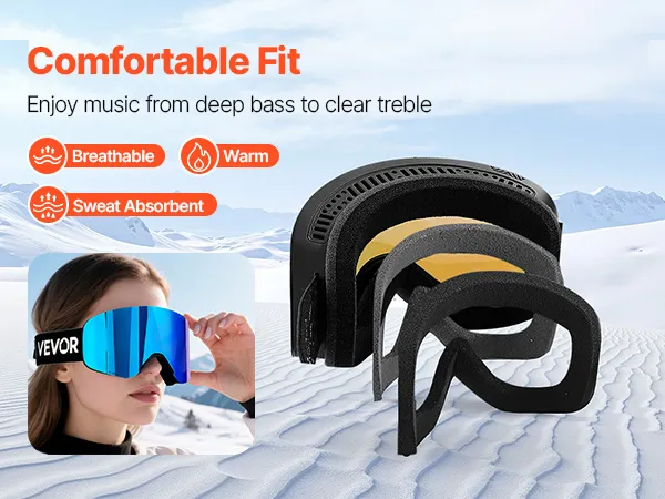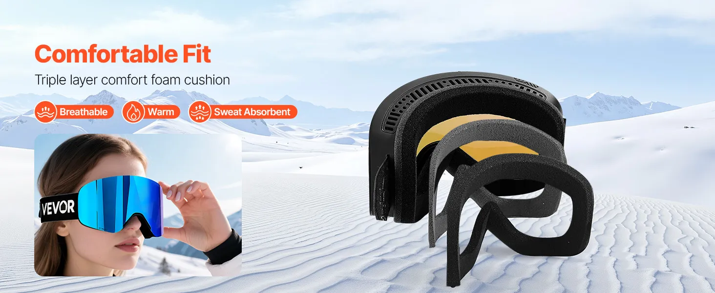 Soft triple-layer foam of the snowboard goggles gently contours to your face, absorbing shock and blocking cold air. The breathable, moisture-wicking design keeps you warm, sweat-free, and comfortable for all-day skiing.