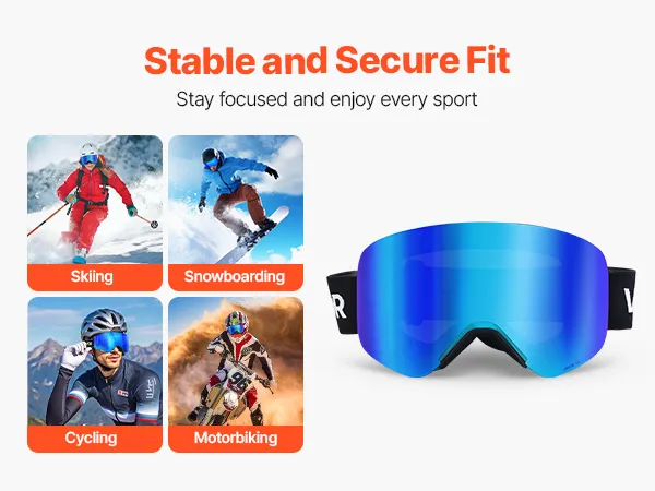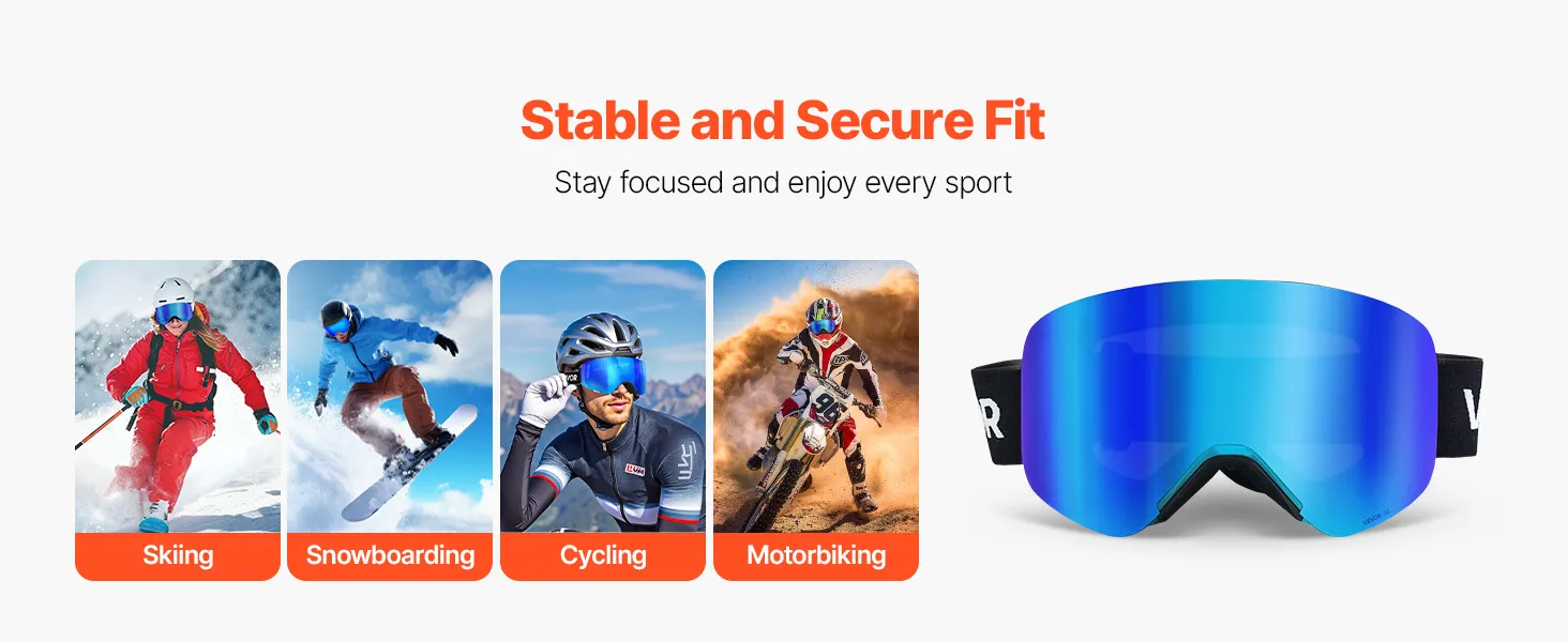 The snug fit hugs your face shape, so the skiing goggles stay in place even during intense activity. Clear, fog-free vision keeps you focused whether you’re skiing, snowboarding, or cycling.