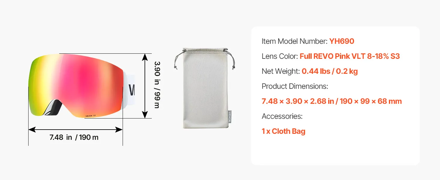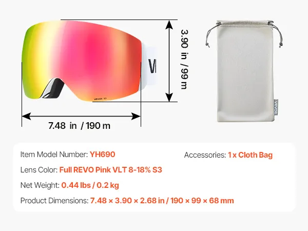 VEVOR Frameless Ski Goggles, Spherical Lens with Pink Revo Coating, OTG Anti fog Snow Goggles for Men Women Youth, TPU Frame & Ventilation Structure, Suitable for Skiing, Skating, Snowboarding