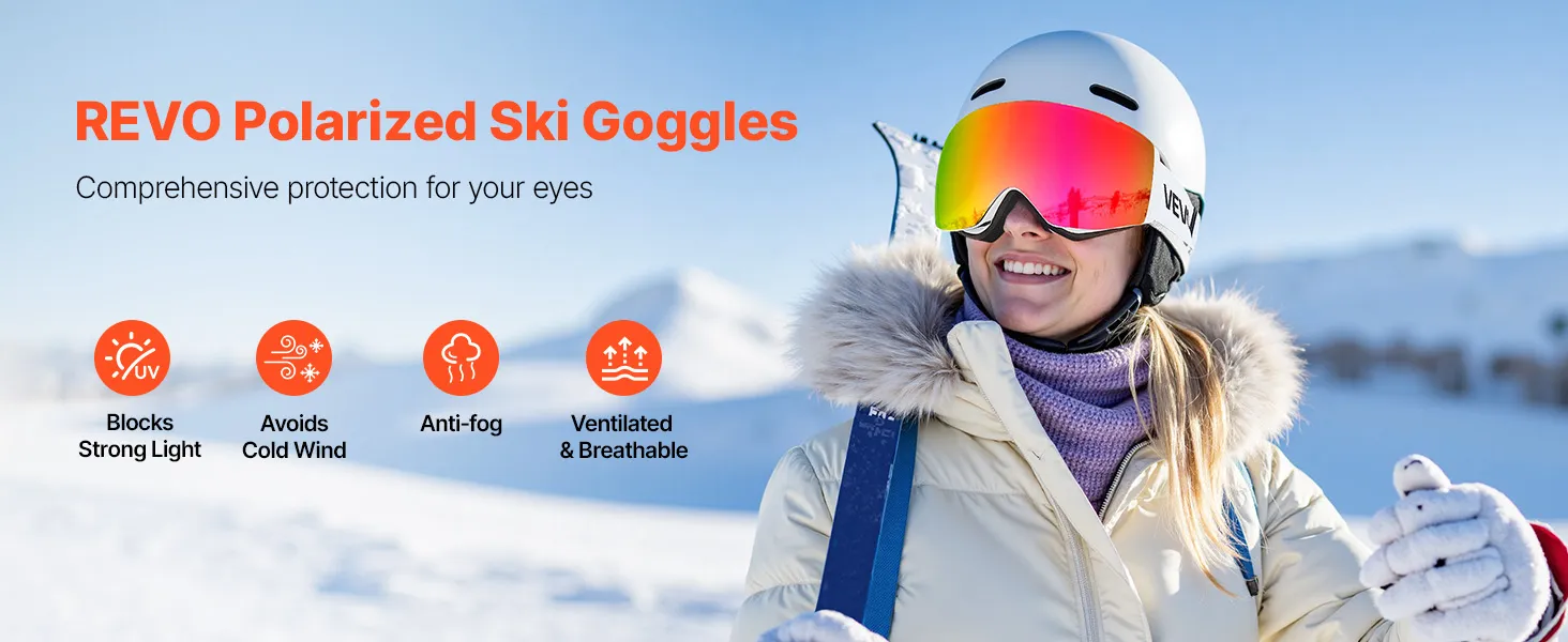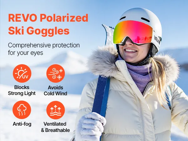 These Revo ski goggles block harsh sunlight and reduce snow glare to help prevent snow blindness. They shield you from cold wind, keep your view fog-free, and maintain fresh airflow so you can enjoy every run with confidence.
