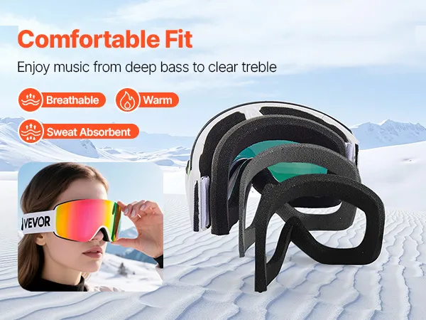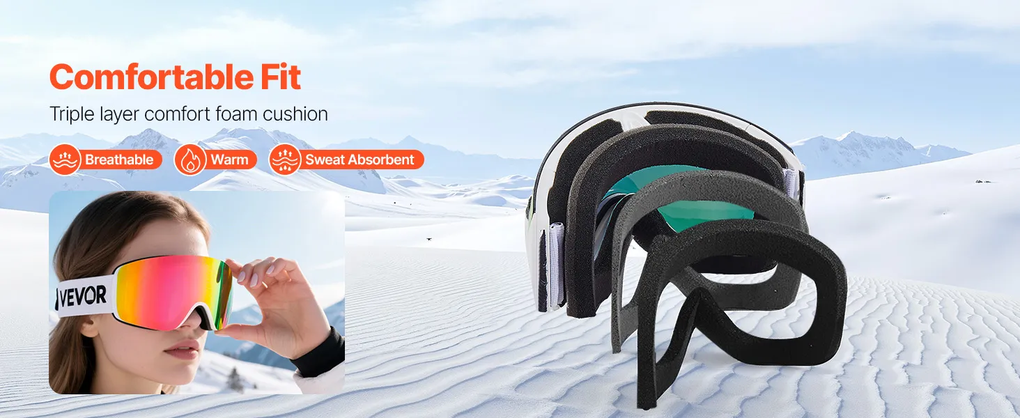 Soft triple-layer foam of the snowboard goggles gently contours to your face, absorbing shock and blocking cold air. The breathable, moisture-wicking design keeps you warm, sweat-free, and comfortable for all-day skiing.