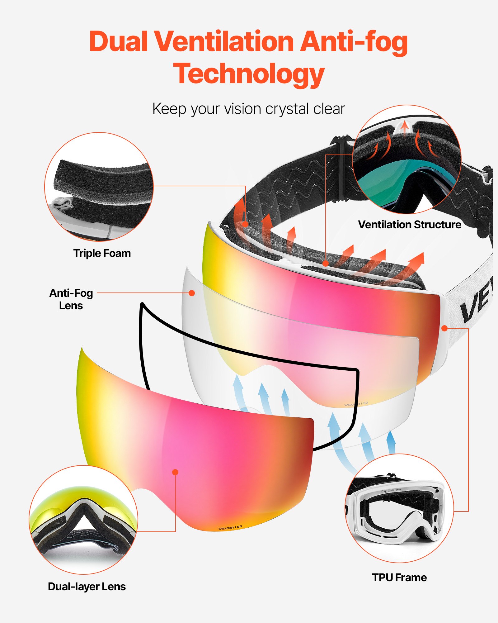 Soft triple-layer foam of the snowboard goggles gently contours to your face, absorbing shock and blocking cold air. The breathable, moisture-wicking design keeps you warm, sweat-free, and comfortable for all-day skiing.