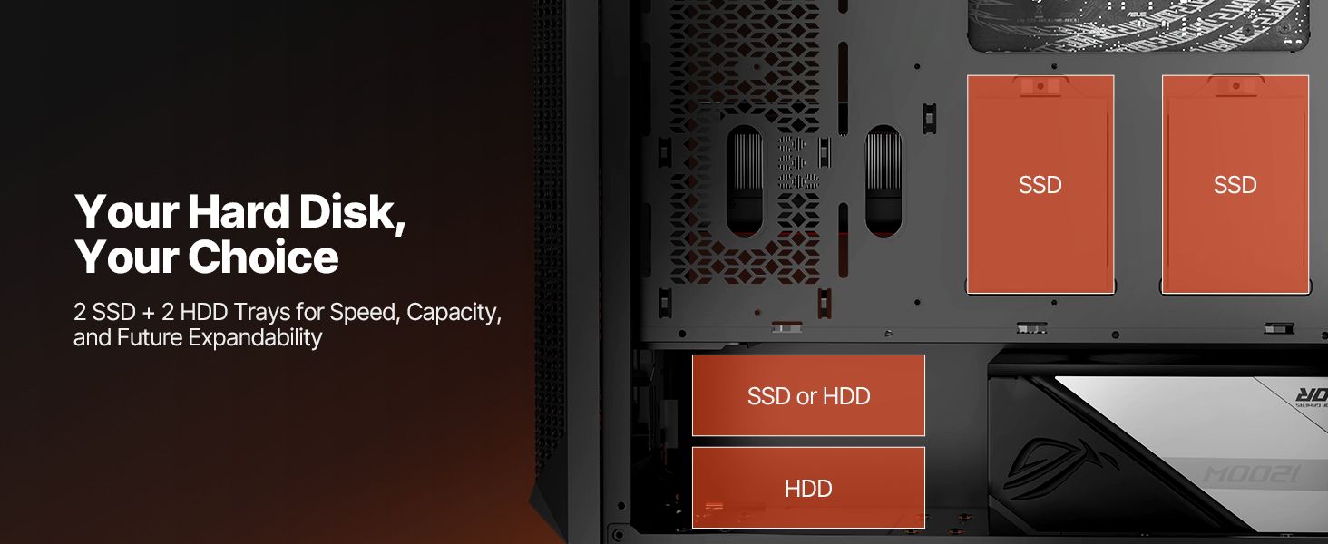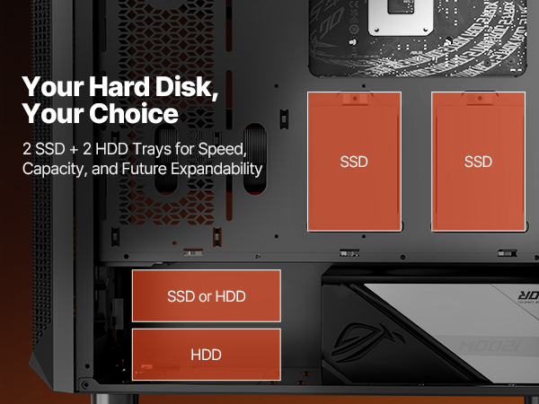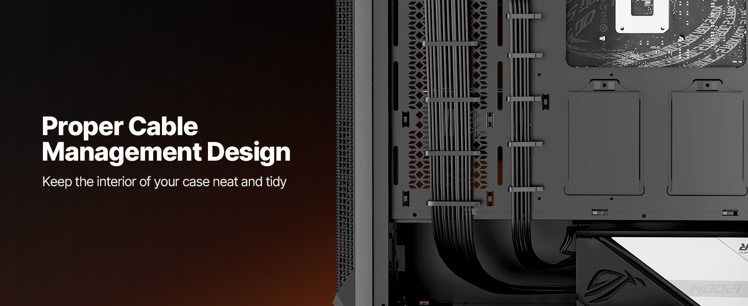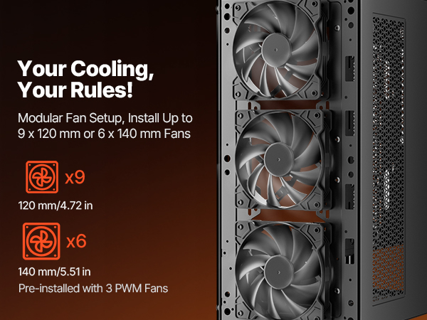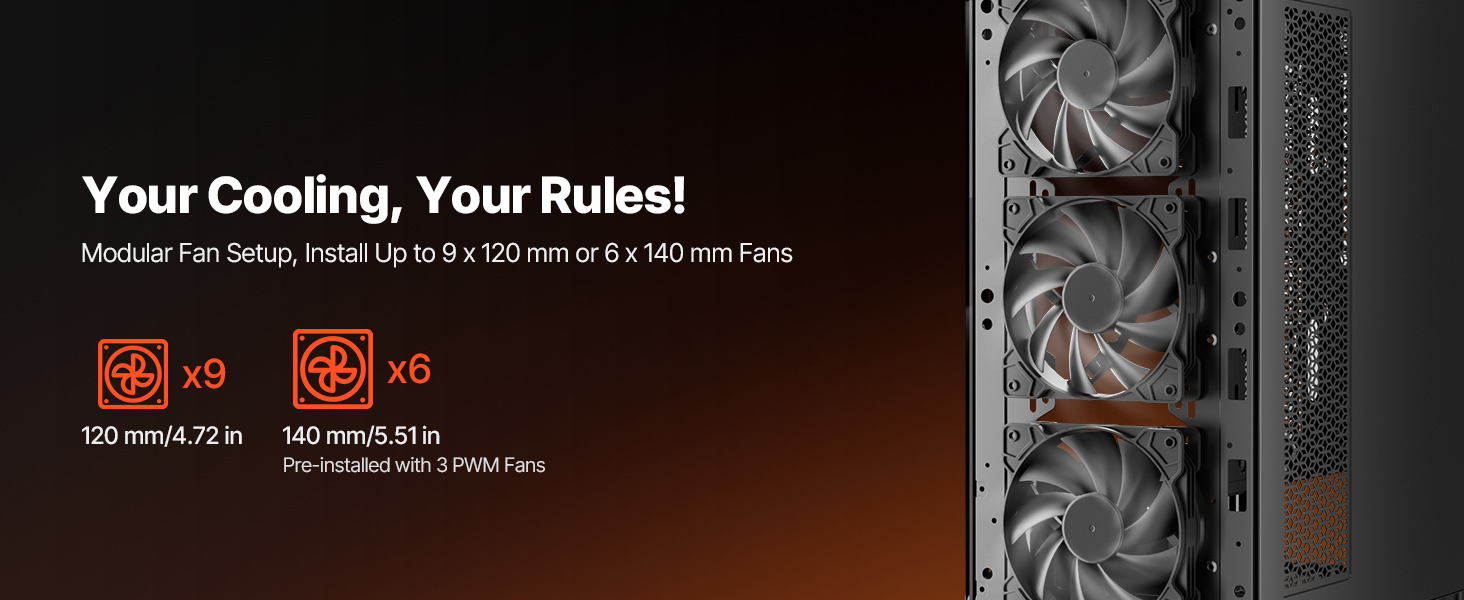Этот корпус совместим с более профессиональными материнскими платами E-ATX. Он поставляется с 3 ШИМ-вентиляторами x 140 мм и поддерживает до 9 вентиляторов x 120 мм или 6 вентиляторов x 140 мм + 2 вентилятора x 120 мм, обеспечивая оптимальную производительность охлаждения. С местом для размещения до 4 жестких дисков (3 твердотельных накопителя + 1 жесткий диск x или 2 твердотельных накопителя + 2 жестких диска x).