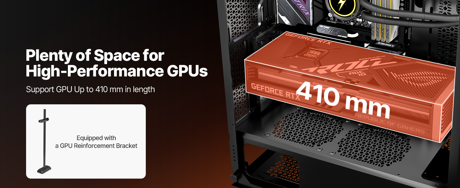 О: Да, это так! Этот корпус совместим с материнскими платами ATX / E-ATX и поддерживает графический процессор длиной до 16,14 дюйма / 410 мм. Он также обеспечивает достаточно места для больших радиаторов длиной до 420 мм.
