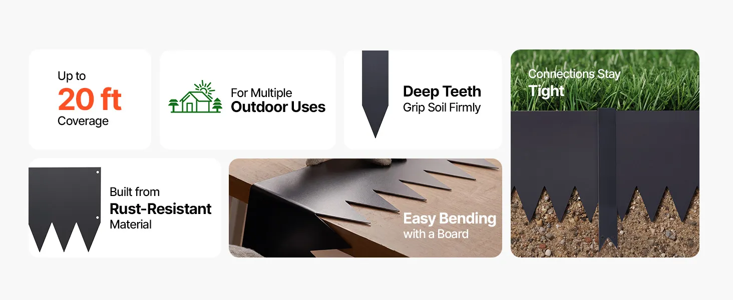 • Гибкий, дружелюбный к саду дизайн: этот стальной ландшафтный окантовка легко изгибается, чтобы следовать прямым линиям или углам. гибкая структура поддерживает пользовательские планировки, помогая краям сада выглядеть чистыми и хорошо сформированными