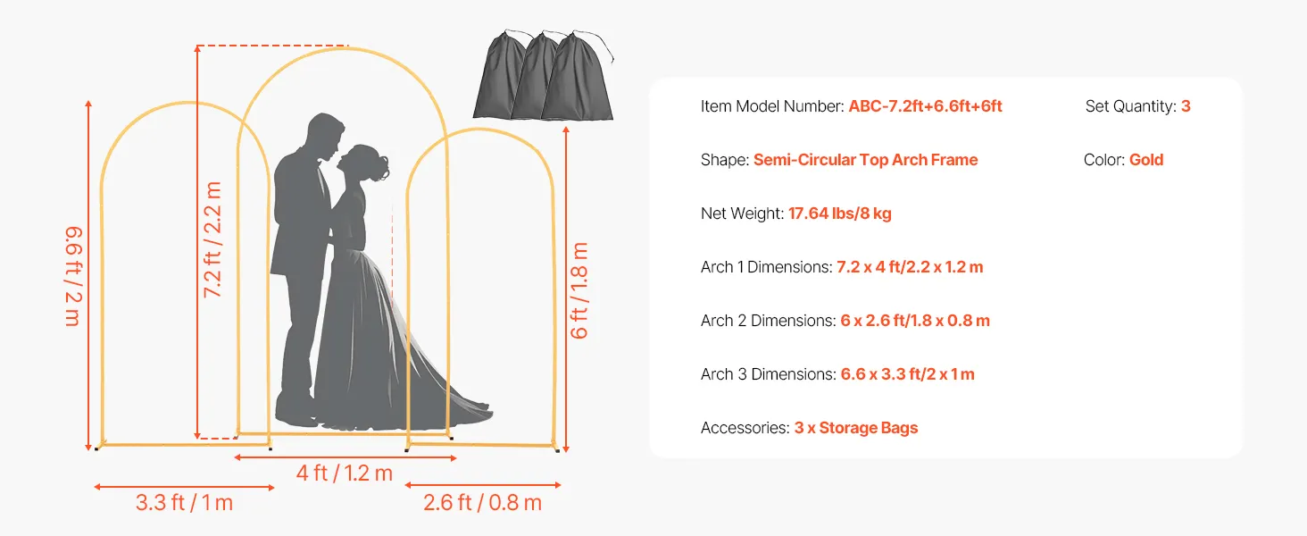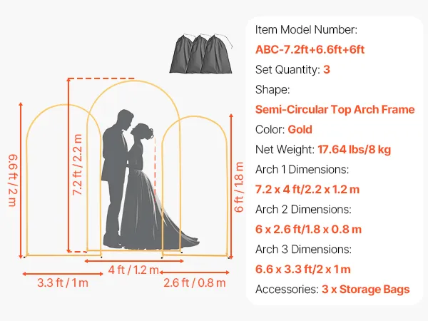 VEVOR Arch Backdrop Stand, Set of 3, 2.2/2/1.8 m , Stable Structure, Easy Assembly, Gold Metal Arch Backdrop Stand for Wedding, Birthday Party, Graduation, Holiday Celebration, and Ceremony Decoration