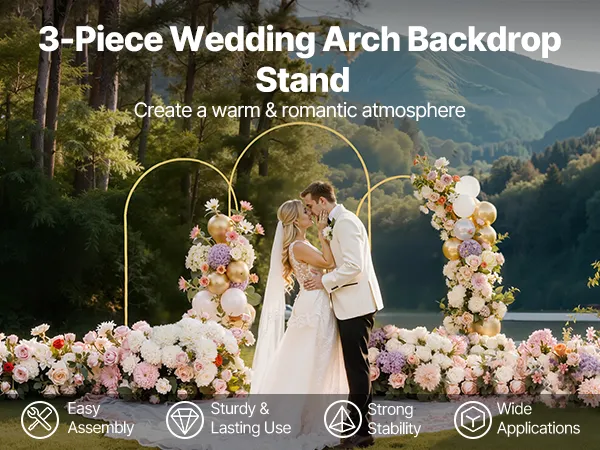 This 3-set arch backdrop stand is easy to assemble. Featuring a metal frame, it ensures stability and long-lasting use. Ideal for both indoor and outdoor occasions, it helps create a warm and romantic atmosphere effortlessly.