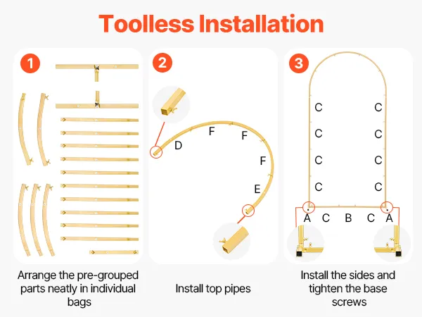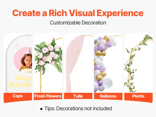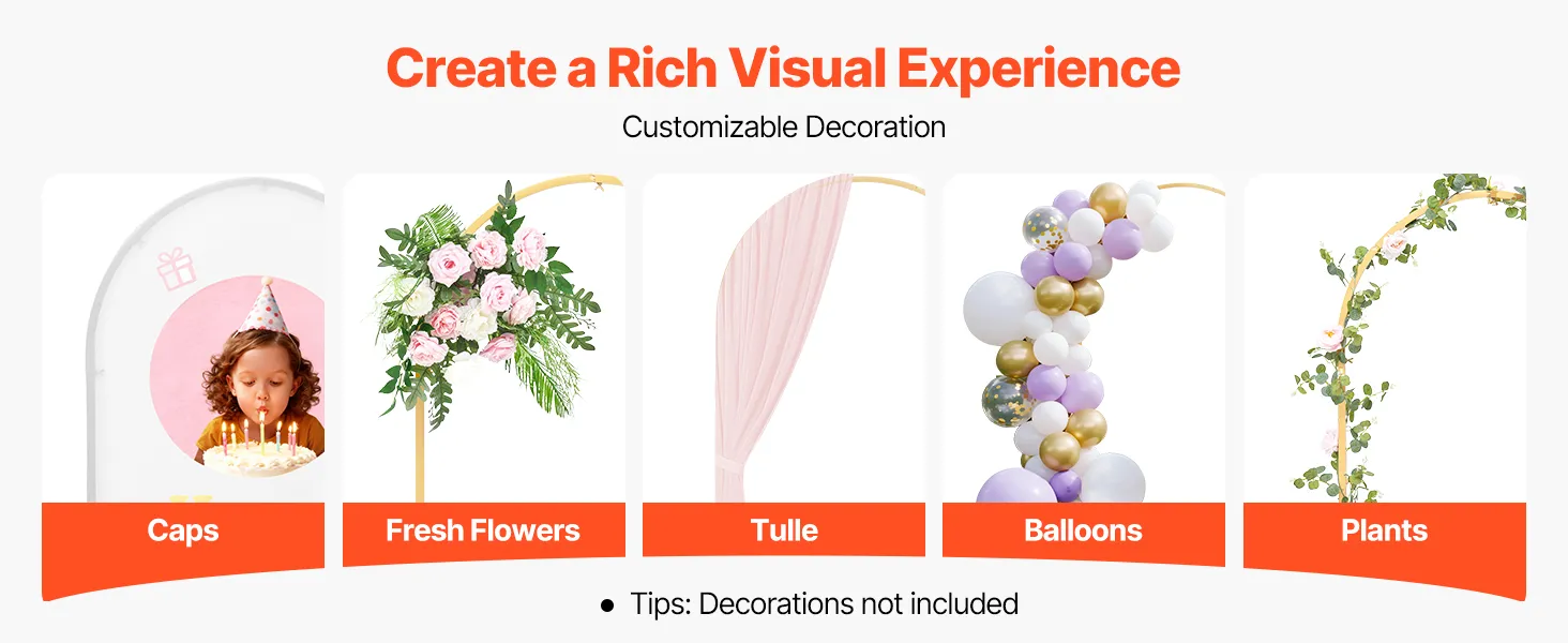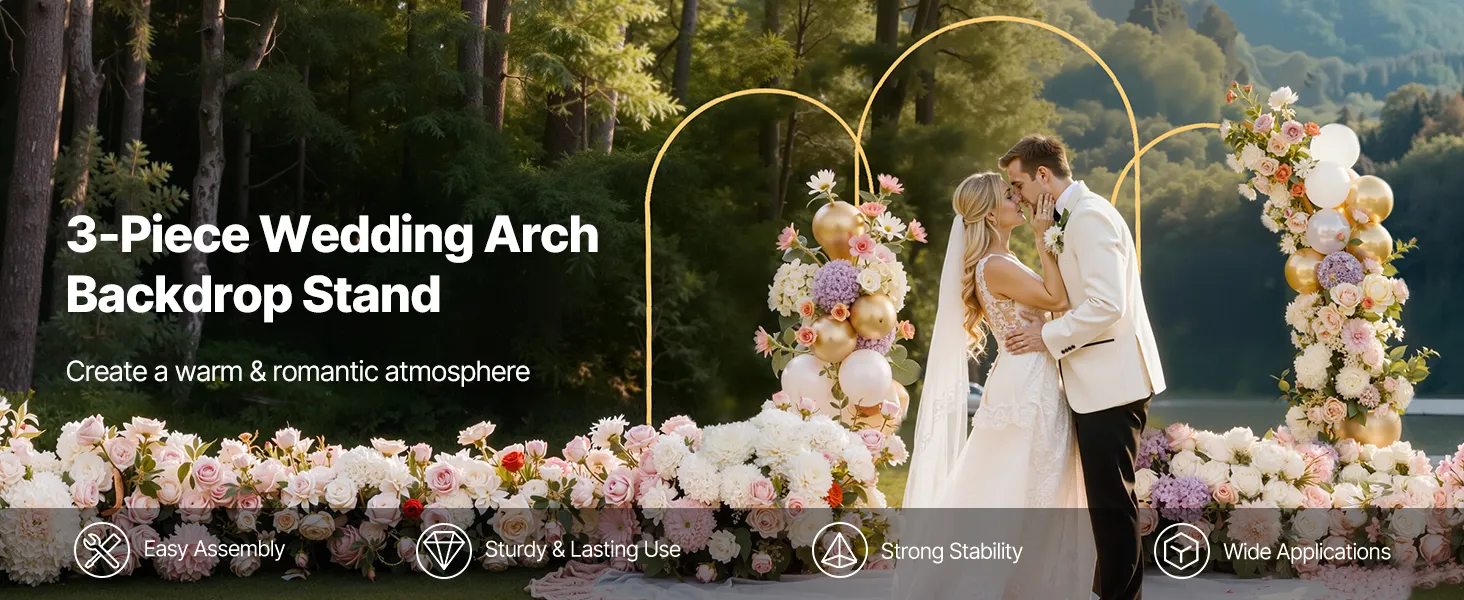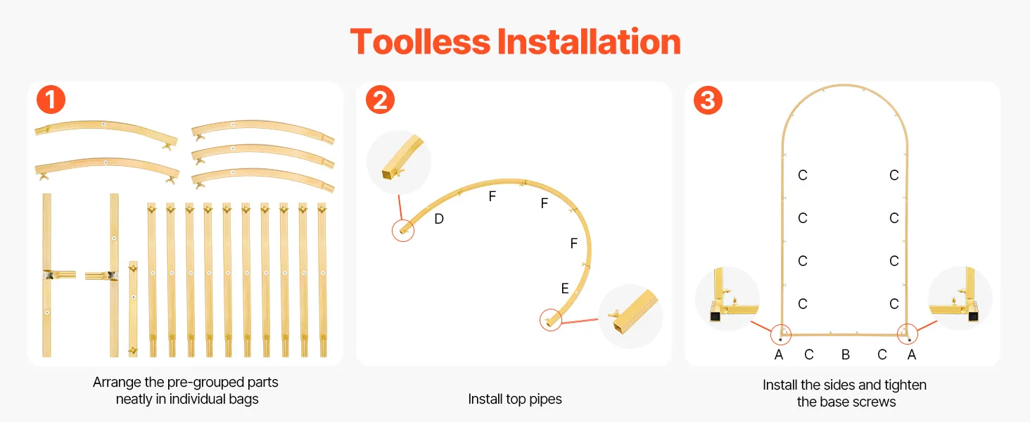 This gold arch backdrop can be installed without tools. Its components are individually bagged and grouped to reduce the difficulty of assembly and help you complete the assembly easily.