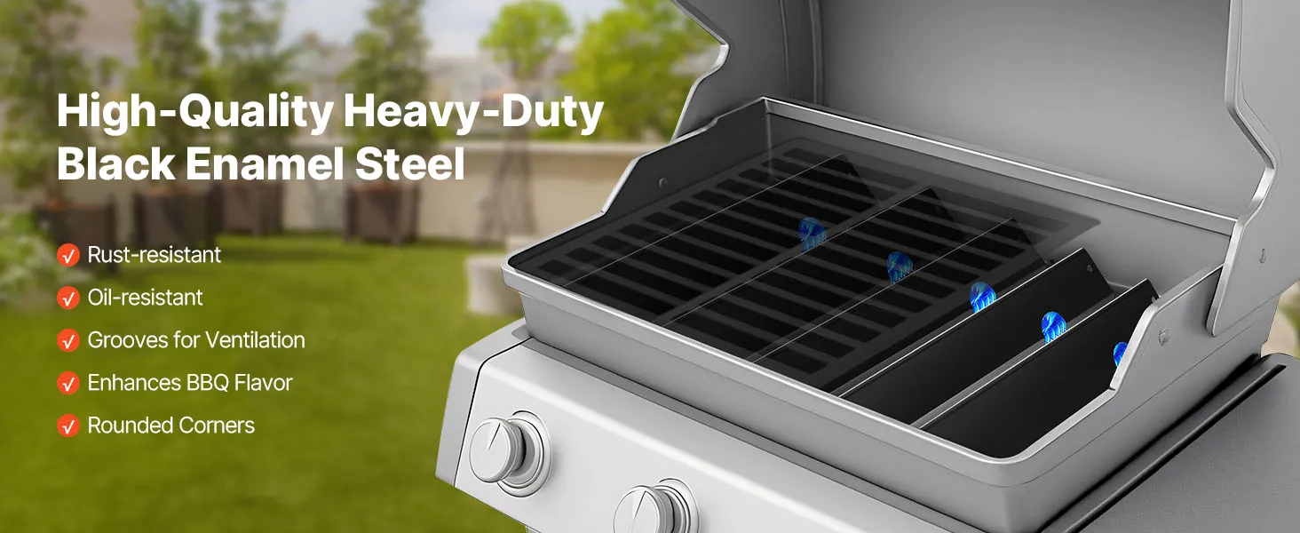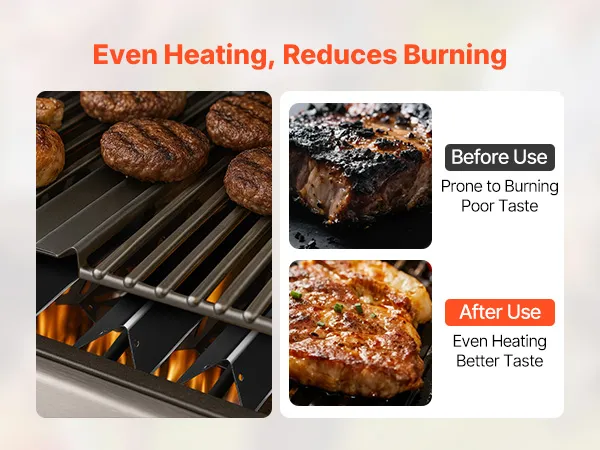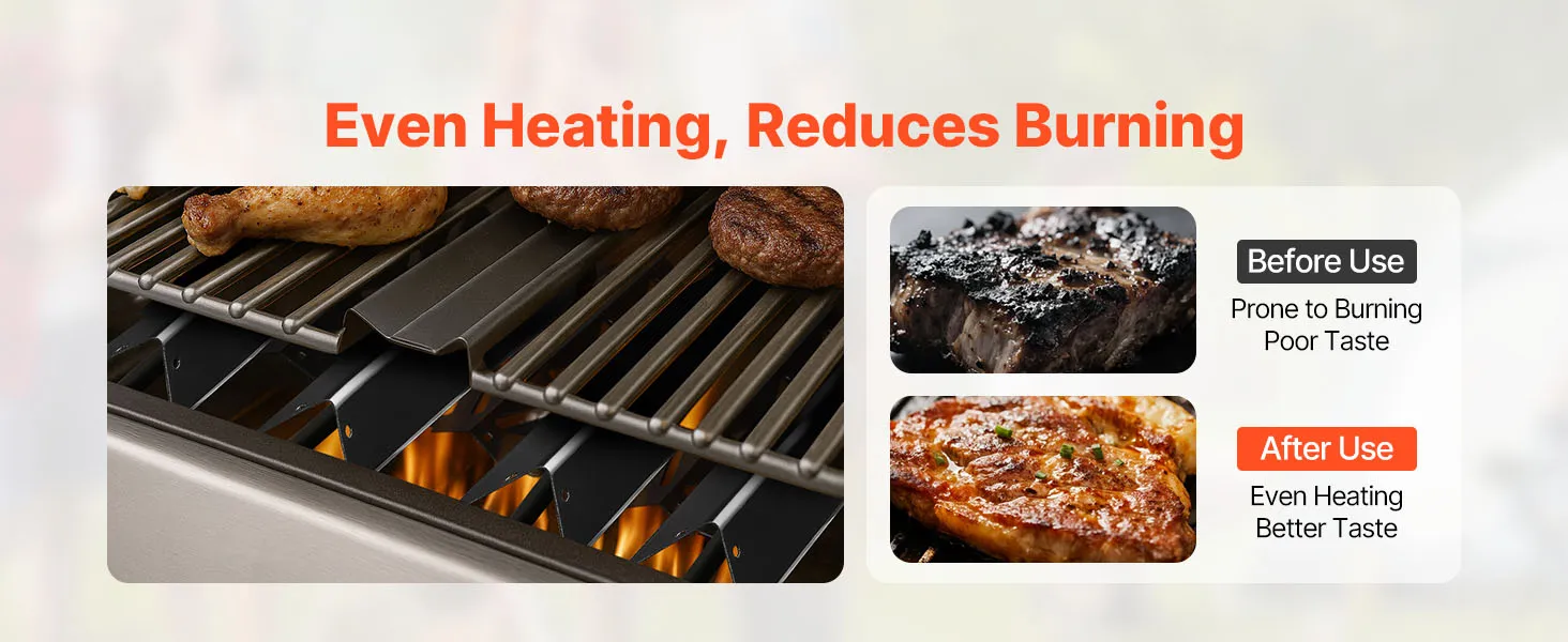 This flavor bar improves heat distribution, preventing food from being directly exposed to flames, thus avoiding burning. It ensures even cooking, reduces flare-ups, and enhances the smoky flavor. It is suitable for beginners.