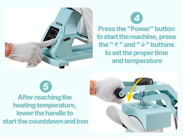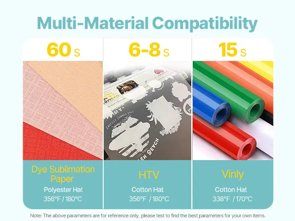 Our heat press for hats provides precise temperature (33.8℉–450℉) and time (up to 999 s) controls for optimal printing on various materials. Multiple hat platens are included for sublimation paper, polyester, cotton, etc. It is ideal for both beginners and professionals, ensuring easy use.