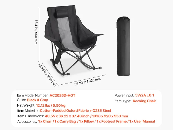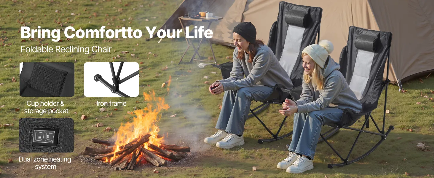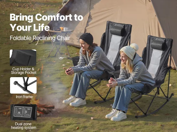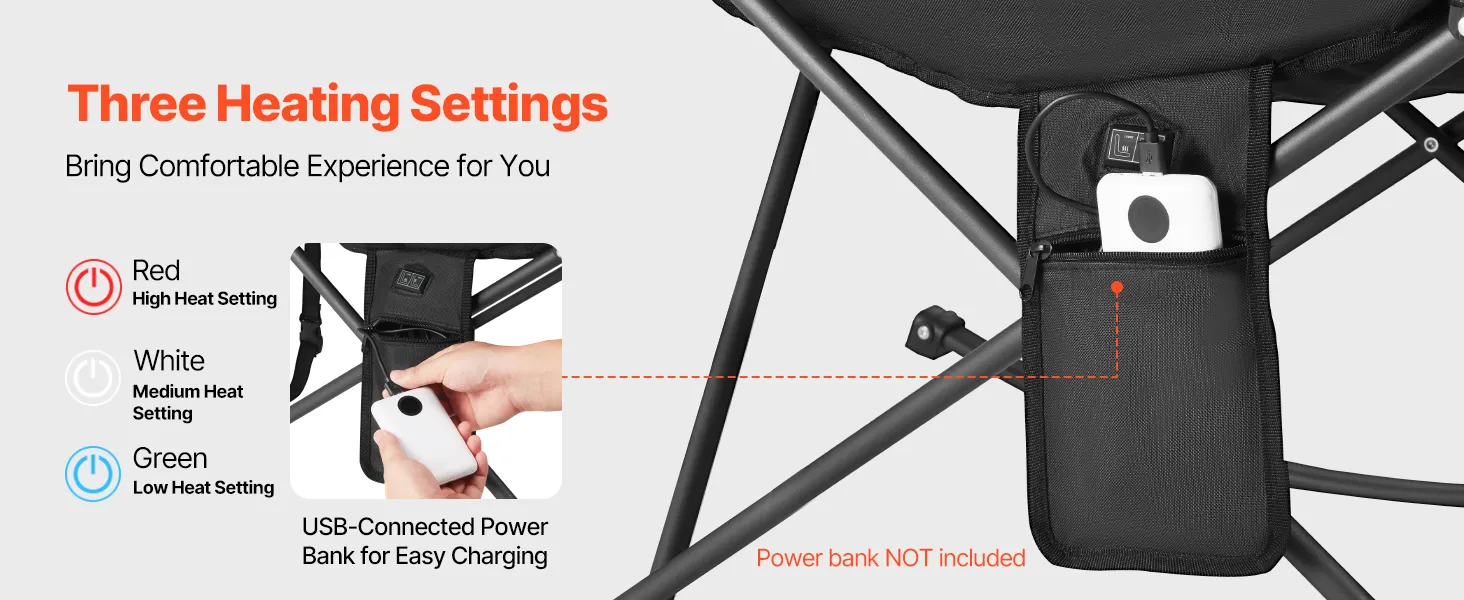 VEVOR Heated Camping Chair, 3 Heating Settings, Large-Sized Padded Folding Rocker, Heavy Duty Outdoor Lawn Chairs with Pocket & Cupholder, Support 225lbs, Portable Heated Chair for Sports Winter Use