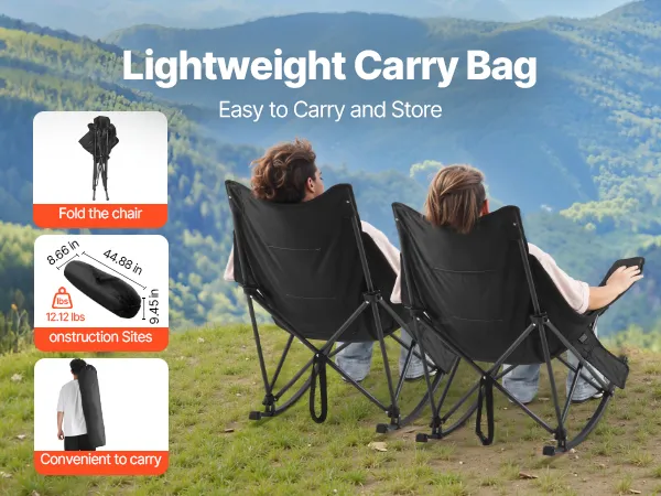 This folding rocker chair comes with a lightweight carry bag. Once folded, the chair fits neatly inside—grab it with one hand and take it wherever comfort calls.