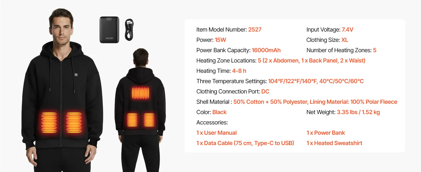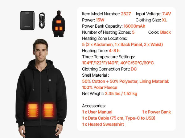 This heated sweatshirt features 5-zone carbon fiber heating for fast, even warmth. It supports three adjustable temperature settings with a 16000 mAh fast-charging power bank. Made of premium fabric, it provides durability and machine-wash convenience for winter wear.