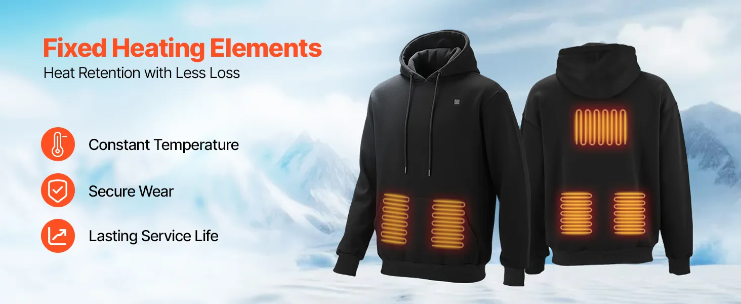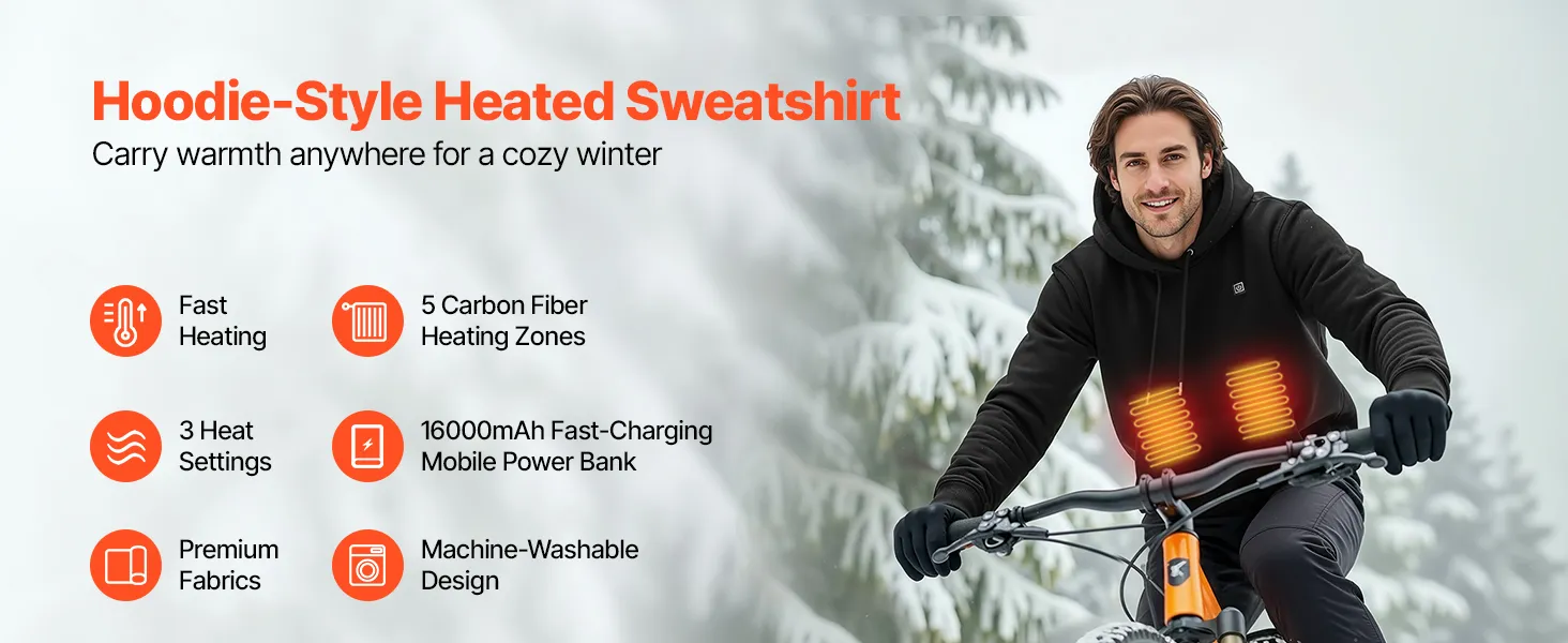 This heated sweatshirt features 5-zone carbon fiber heating for fast, even warmth. It supports three adjustable temperature settings with a 16000 mAh fast-charging power bank. Made of premium fabric, it provides durability and machine-wash convenience for winter wear.