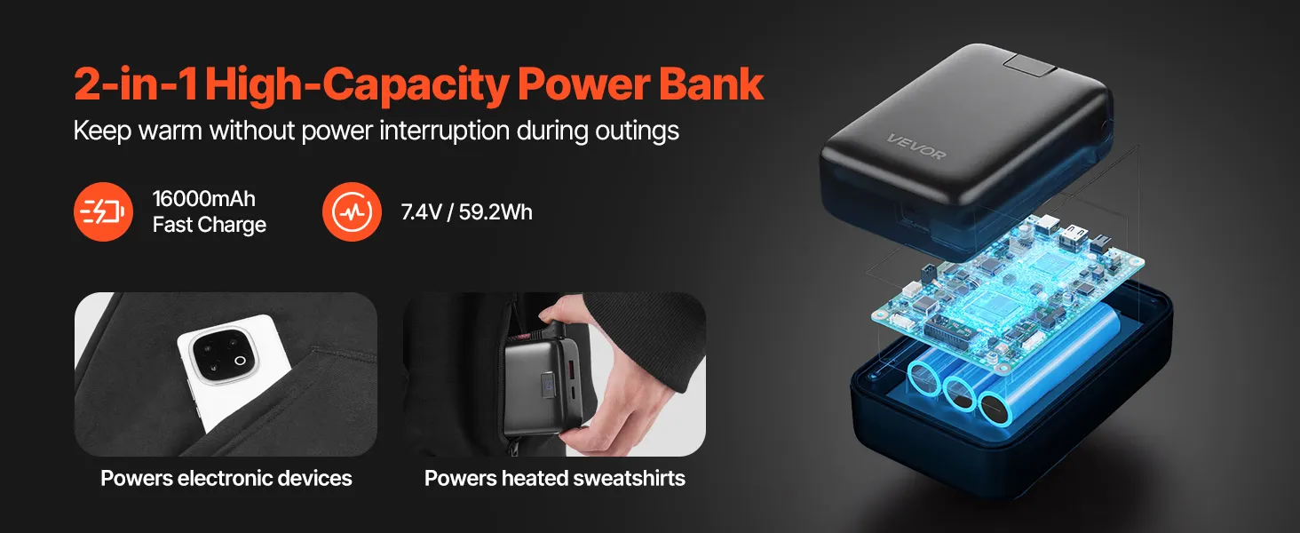 Our heated hoodie features a 16000 mAh fast-charging power bank, providing long-lasting battery life. With 7.4 V/15 W output, it not only keeps the heated sweatshirt warm but also charges your electronic devices during travel.