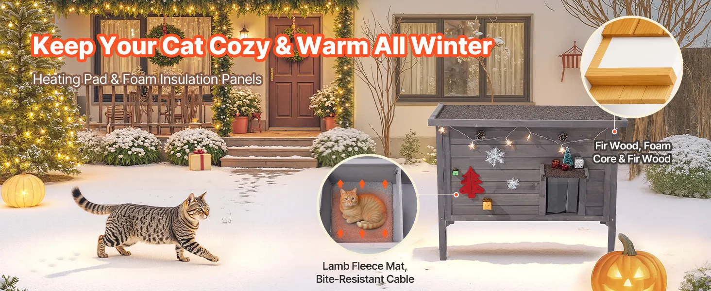 Made from durable and sustainable fir wood, the heated cat house offers a cozy and secure shelter for cats. Includes a heating pad to keep cats warm and comfortable even in harsh winters.